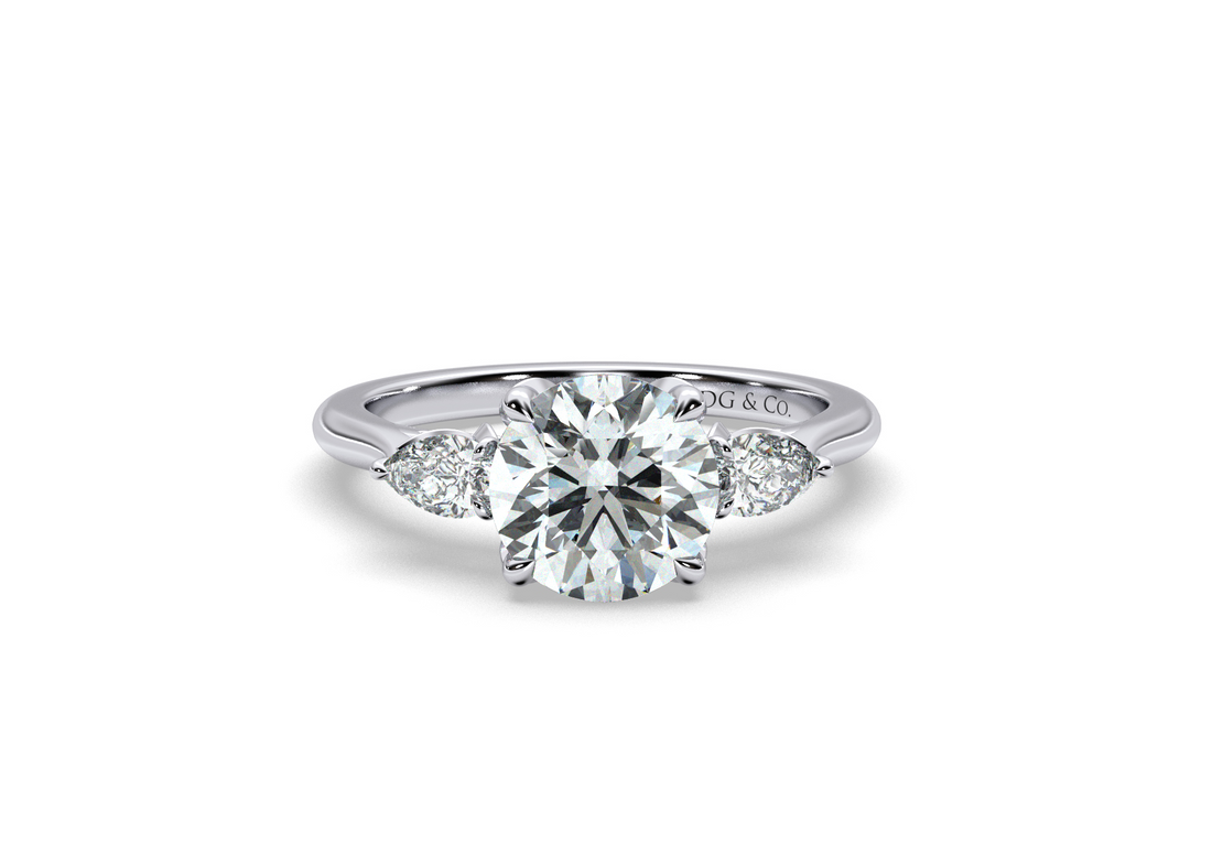 Sima Three stone Round Cut Bezel Four Claw Setting with Pear Shape Cut Side stones -18K White