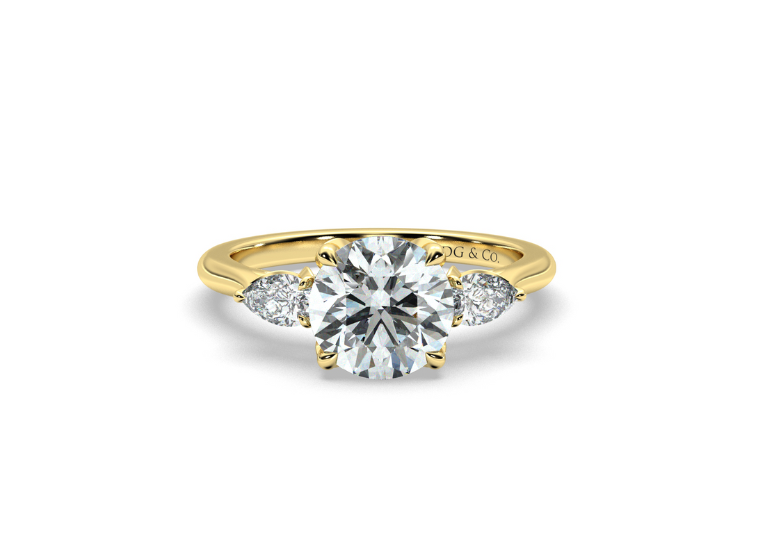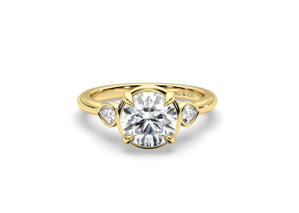 Sima Three stone Round Cut Bezel Four Claw Setting with Pear Shape Cut Side stones -18K Yellow