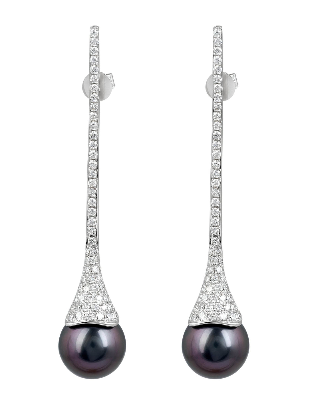 Tahitian Cultured Black Pearl and Diamond Long Drop Earrings In 18K White Gold - DG & Co. Jewellery