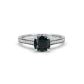 Bold and timeless, this 18K gold ring boasts a distinctive design from every angle. A Cushion blue sapphire sits in a French pavé setting, lifting it just high enough above diamonds set in the band to flood it with their brilliant white light.