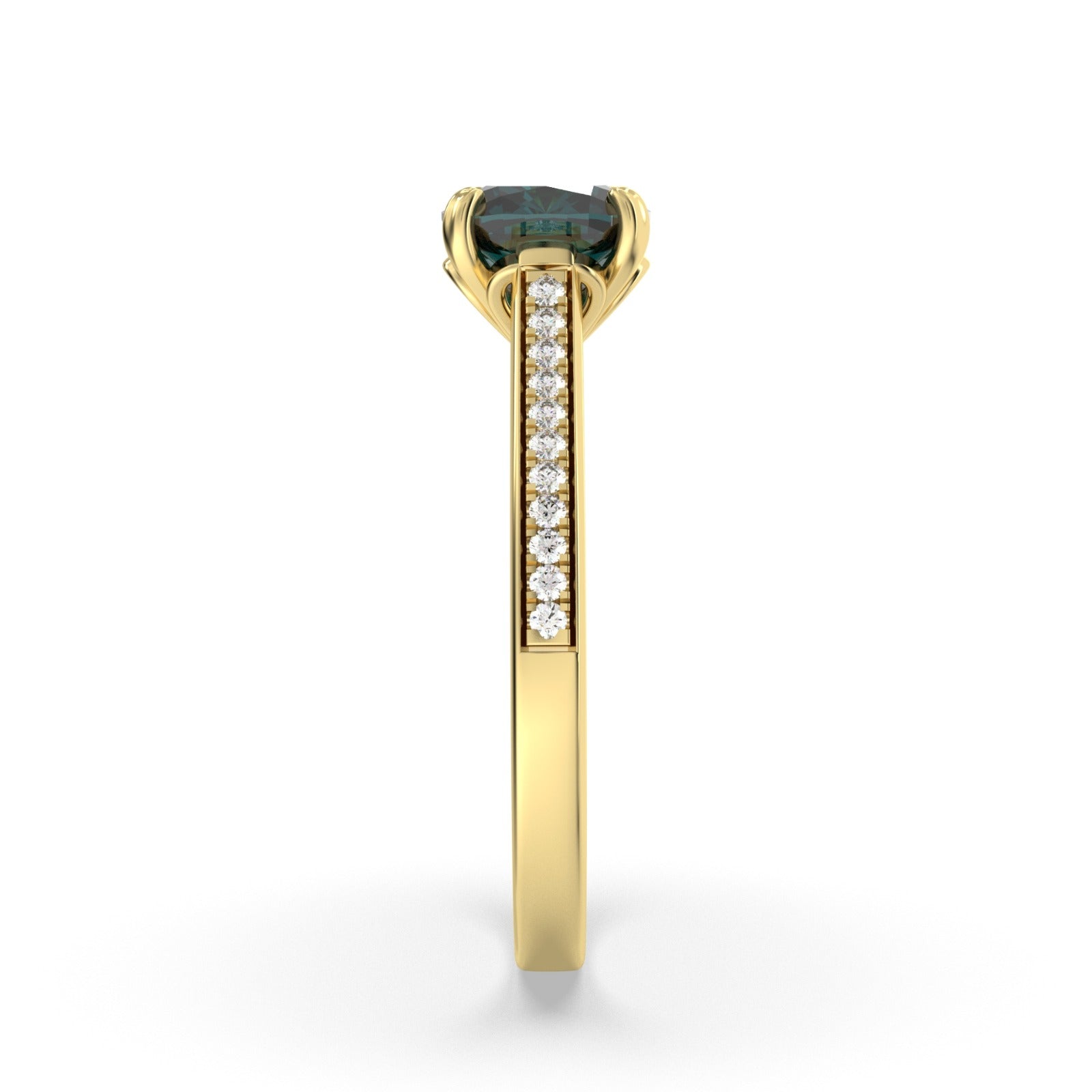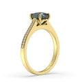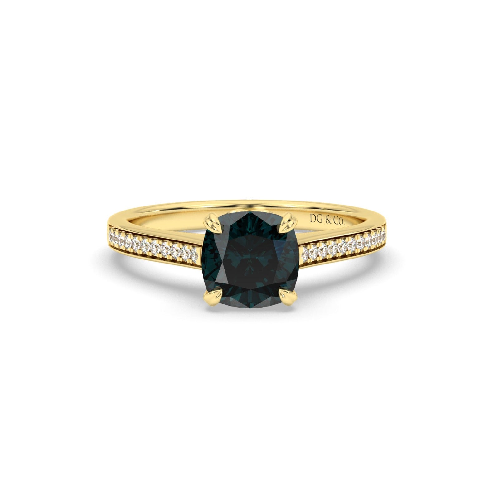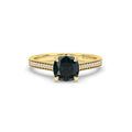 Bold and timeless, this 18K gold ring boasts a distinctive design from every angle. A Cushion blue sapphire sits in a French pavé setting, lifting it just high enough above diamonds set in the band to flood it with their brilliant white light.