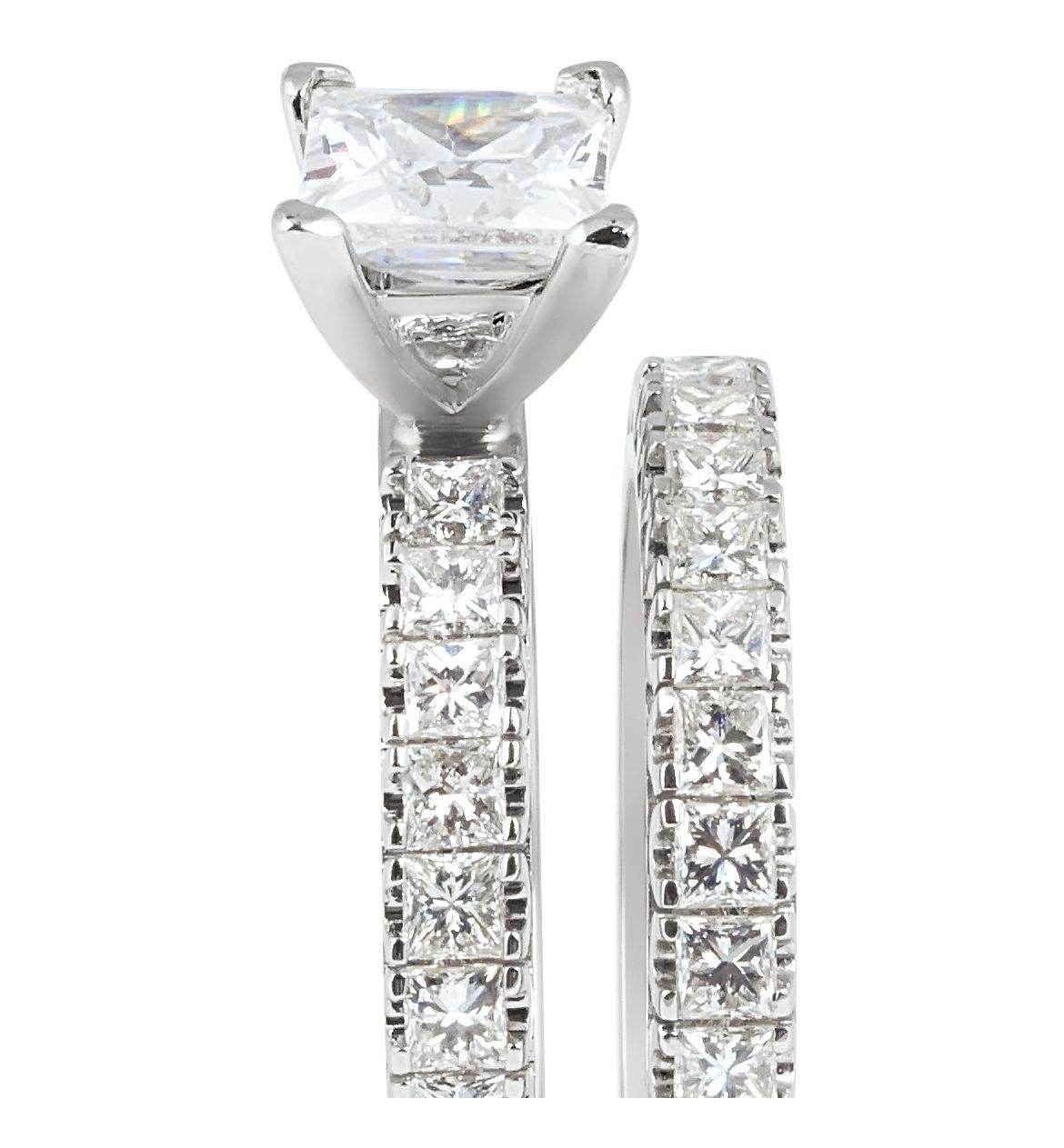 This Modern Fancy Wedding set rings set with Princess cut diamond 1.00 Carat E color VS2 clarity GIA certificate in four claws corner setting in the centre and Thirty-eight Princess cut diamond on the side and in the wedding band . 100% Eye Clean Ball Of Fire.