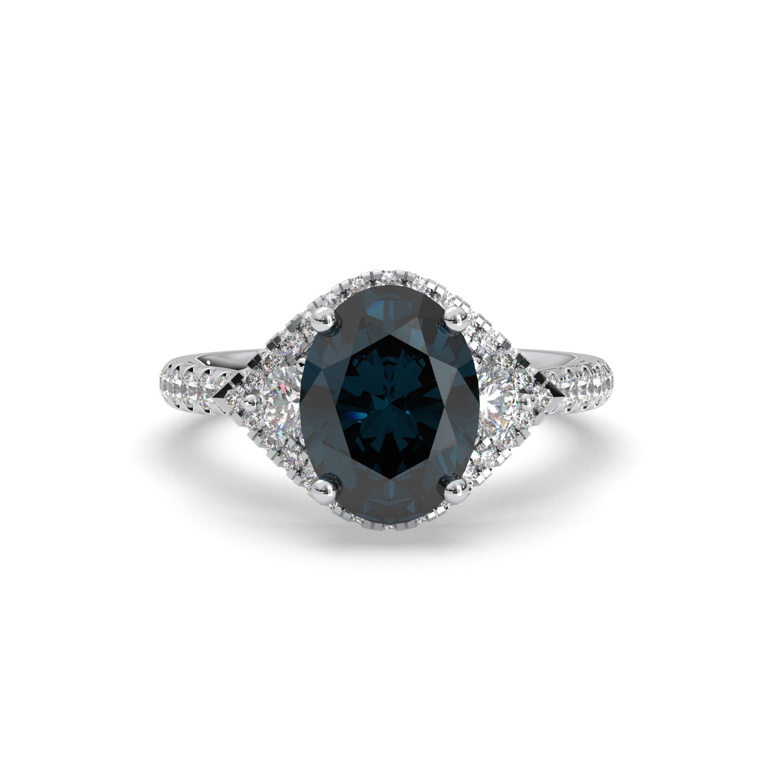 Put high style on her finger with this iconic oval sapphire and diamond ring. A statement-making deep royal blue faceted oval sapphire is encircled by round brilliant-cut diamonds set in traditional 18k white gold. Petite diamonds across the shoulders of the band add an extra dose of sparkle. A beautiful alternative to a diamond engagement ring.