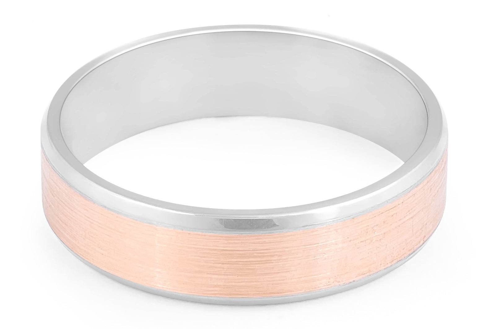 Specially designed, this 18 karat two tone men's wedding ring features a wide rose gold centre stripe with a fine satin finish surrounded by bevelled edges for a handsome look and feel.