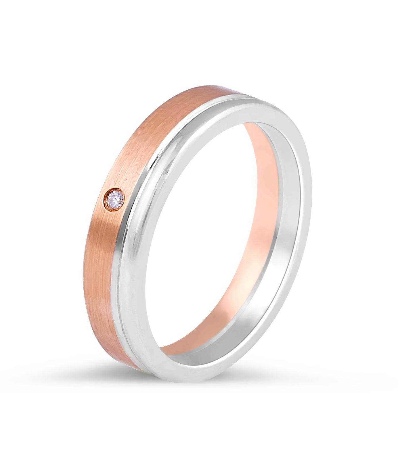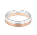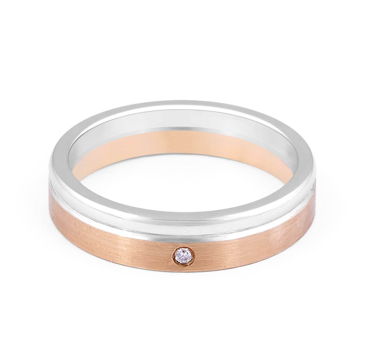 Modern wedding band design with straight edges featuring a burnish set round brilliant diamond. Two-tone feature is enhanced by the contrast of brushed and polished metal and an inlay detail.