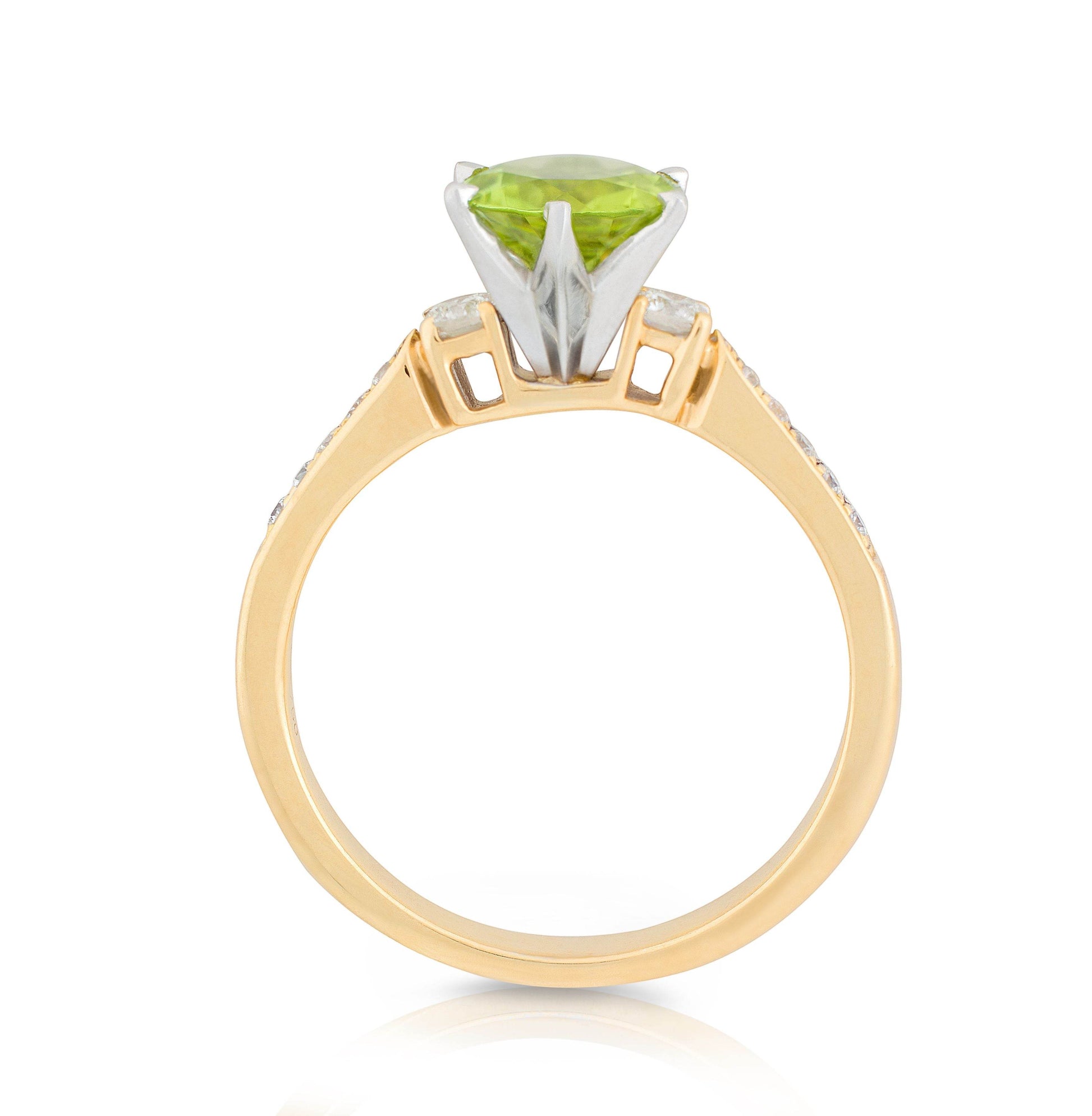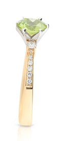 A vibrant green round peridot is complemented by a pair of brilliant round diamonds. The three are set in an 18k white and yellow gold claw-setting and 10 round diamonds pave setting that features an elegant side design.