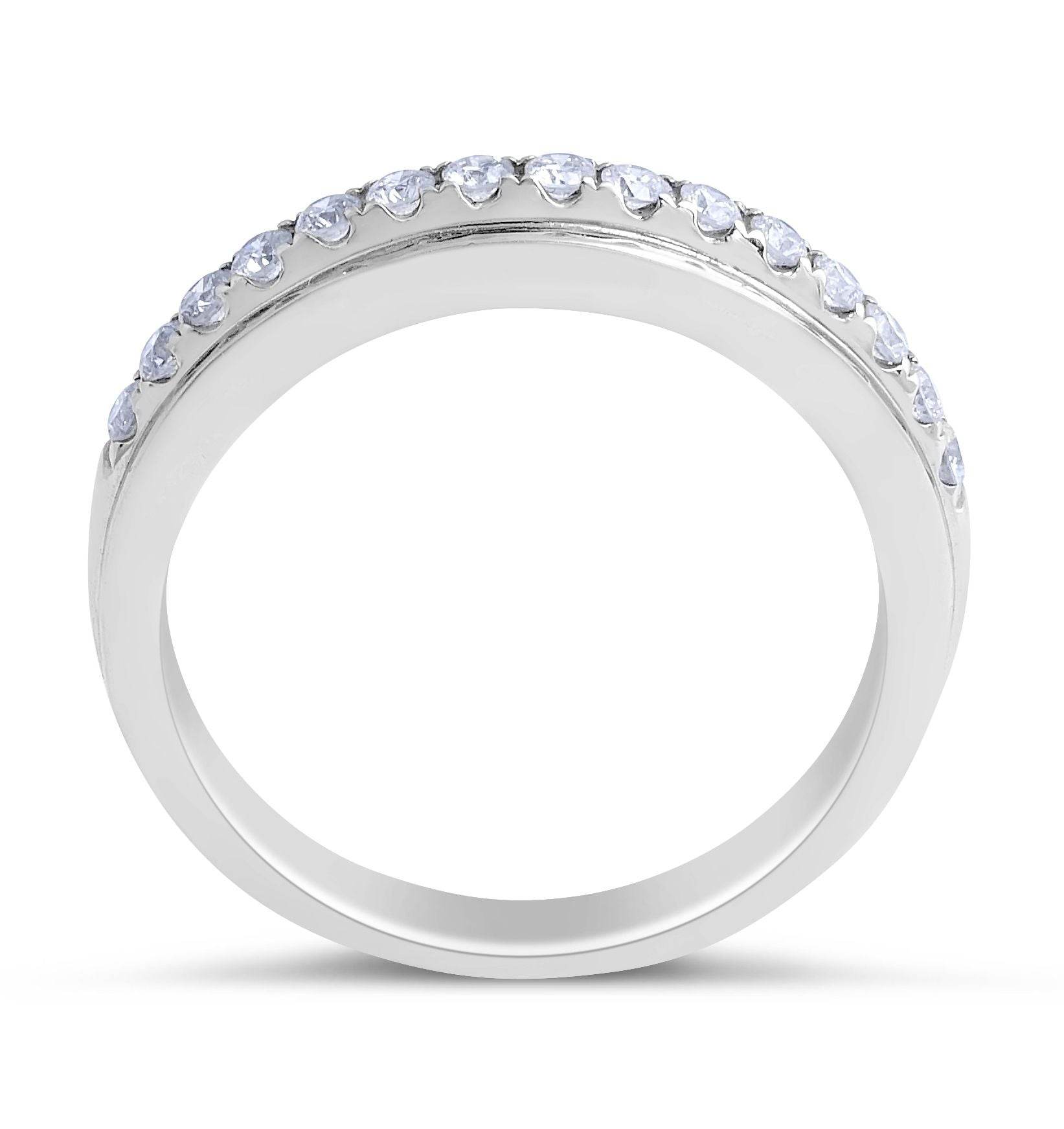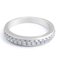 This modern 18K white gold diamond wedding band has 15 round diamonds totalling 0.28 carat in scallop setting. The wide channel look gives the band wonderful presence and it also works as a stand-alone piece. The lifted diamond setting gives the diamonds the maximum sparkle. This ring suits a stylish woman who enjoys contemporary design.
