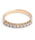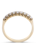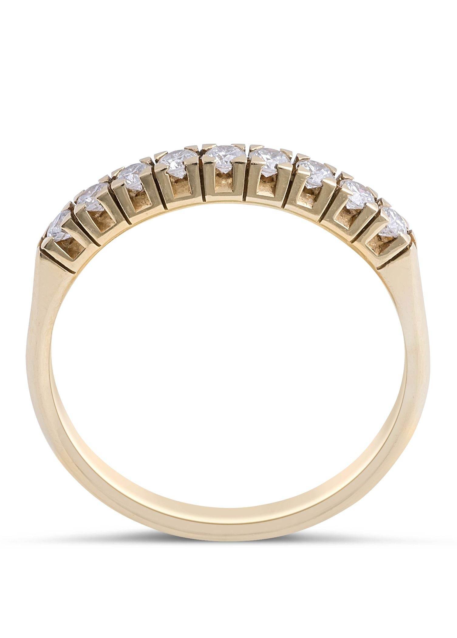 This classic 18K yellow gold diamond wedding band has 9 round diamonds totalling 0.27 carat in claw setting. The timeless design is sure to impress. Suits a woman who is classic and elegant.