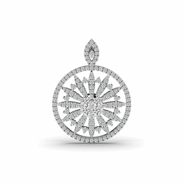 This modern design 18 Karat white gold diamond pendant is intricately set with 144 sparkling round brilliant diamonds totalling 1.80Ct. A truly unique one of a kind design inspired by the dharma wheel symbol. A must buy for those who love luxurious symbolic jewellery.