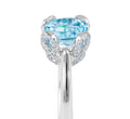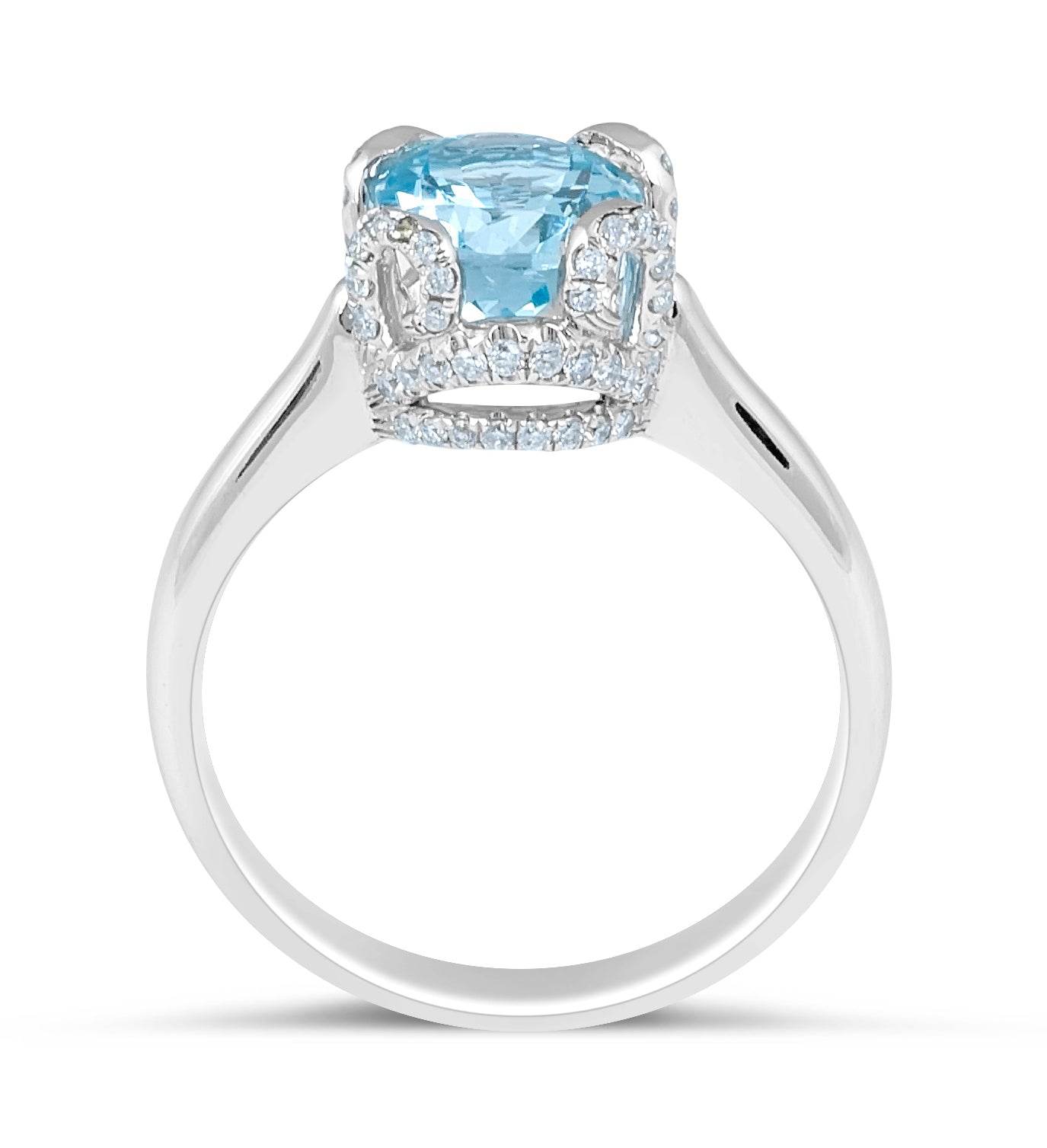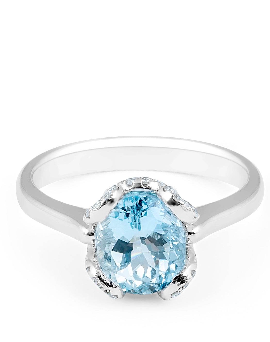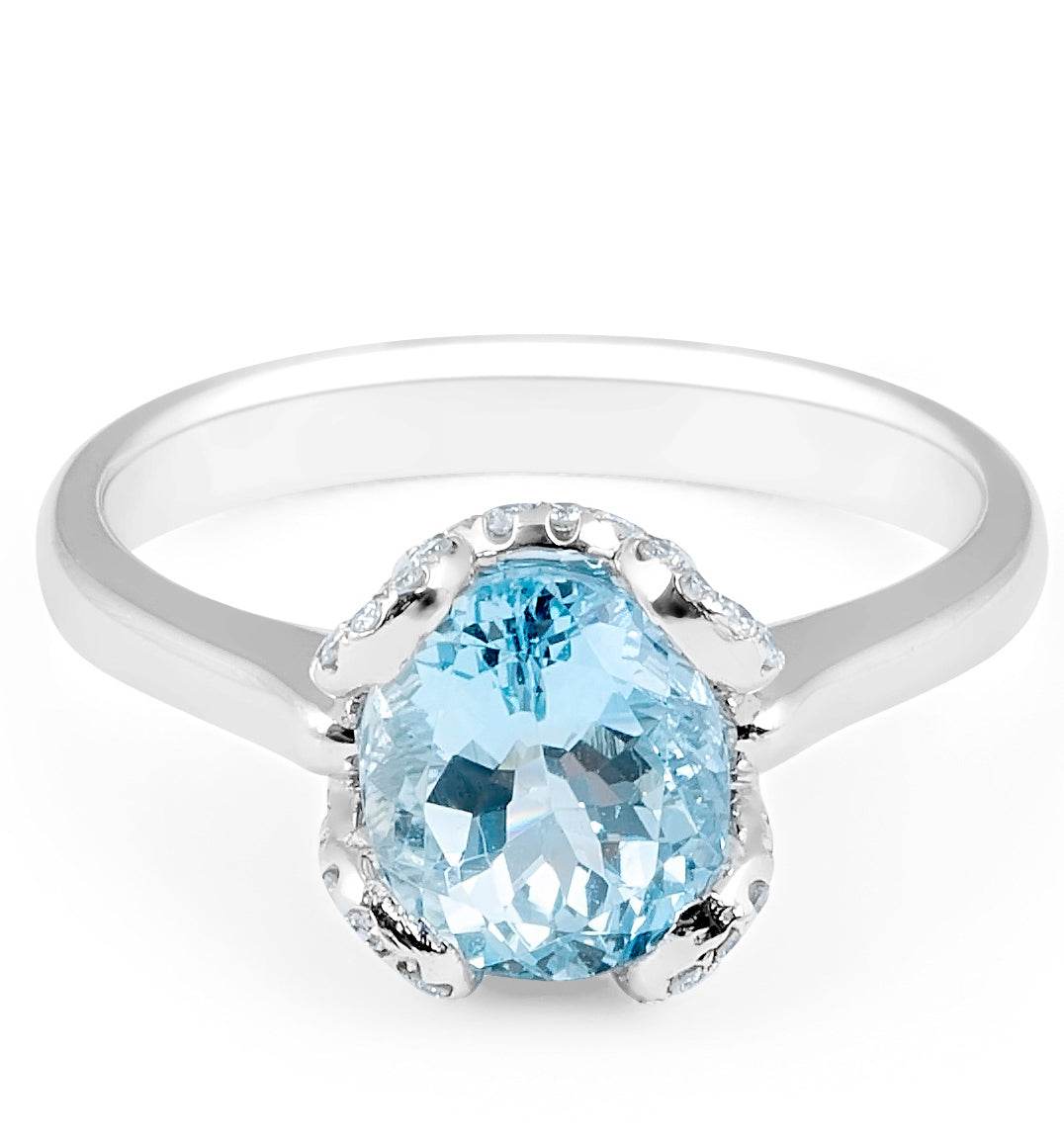 This vintage style 18K white gold aquamarine and diamond ring has a 1.60ct bright blue aquamarine as a centre stone. The oval cut aquamarine is set in claws that form a crown-like shape around it. The claws and the two halos below them are diamond set, offering their lovely sparkle. The plain band of the ring doesn’t take away from the centre stone and setting design. This ring would suit a feminine and classic woman.