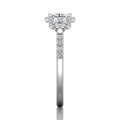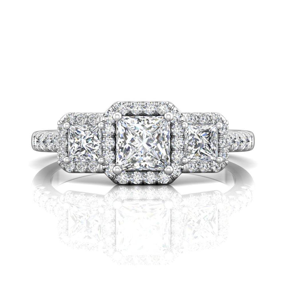 An update to a classic, this dazzling three stone halo engagement ring features 44 diamonds pave setting. The beauty is in the details - this ring sparkles from every angle and is sure to accent your choice of princess-cut centre stone.