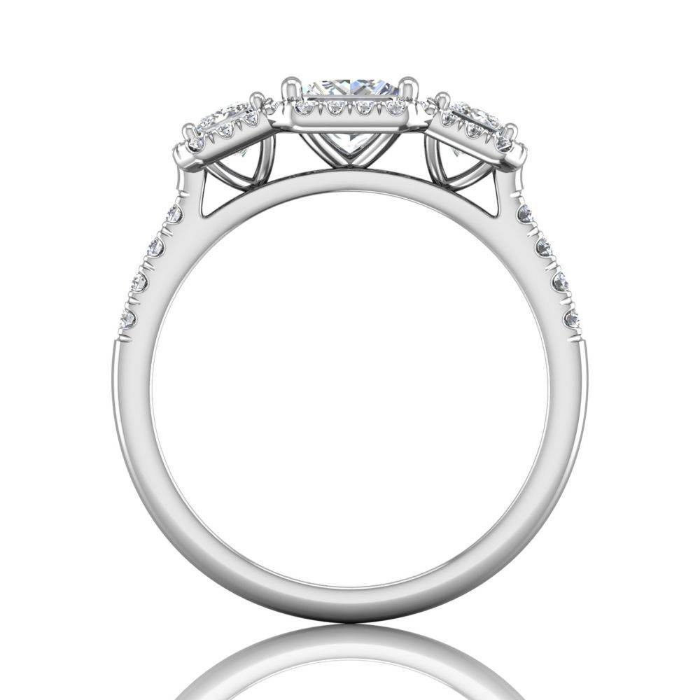 Princess Cut Halo and Three Stone Engagement Ring with Pave Side Stones in 18k White Gold