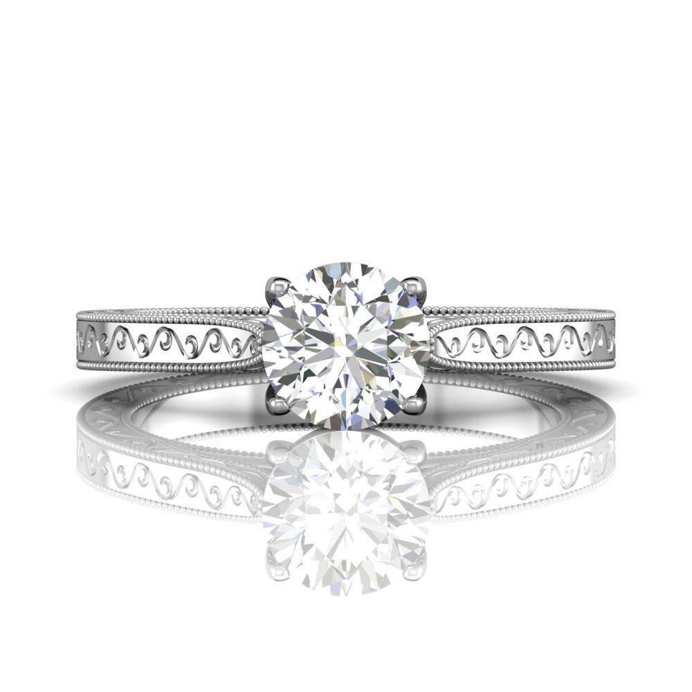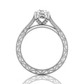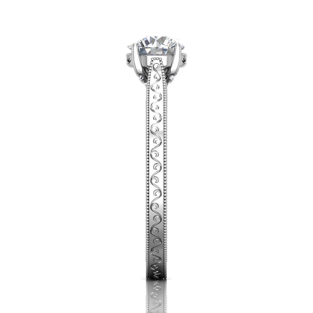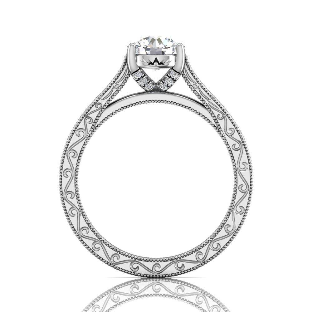 Inspired by vintage design, this 18k white gold diamond engagement ring features a hand-engraved motif throughout, framed by delicate Milgrain edges. And set with pave round brilliant-cut diamonds from both sides of the claws to perfectly accent a centre diamond of your choice.