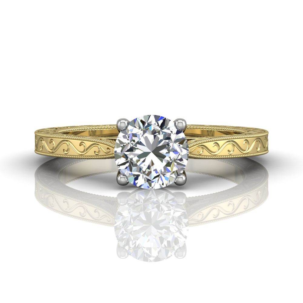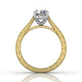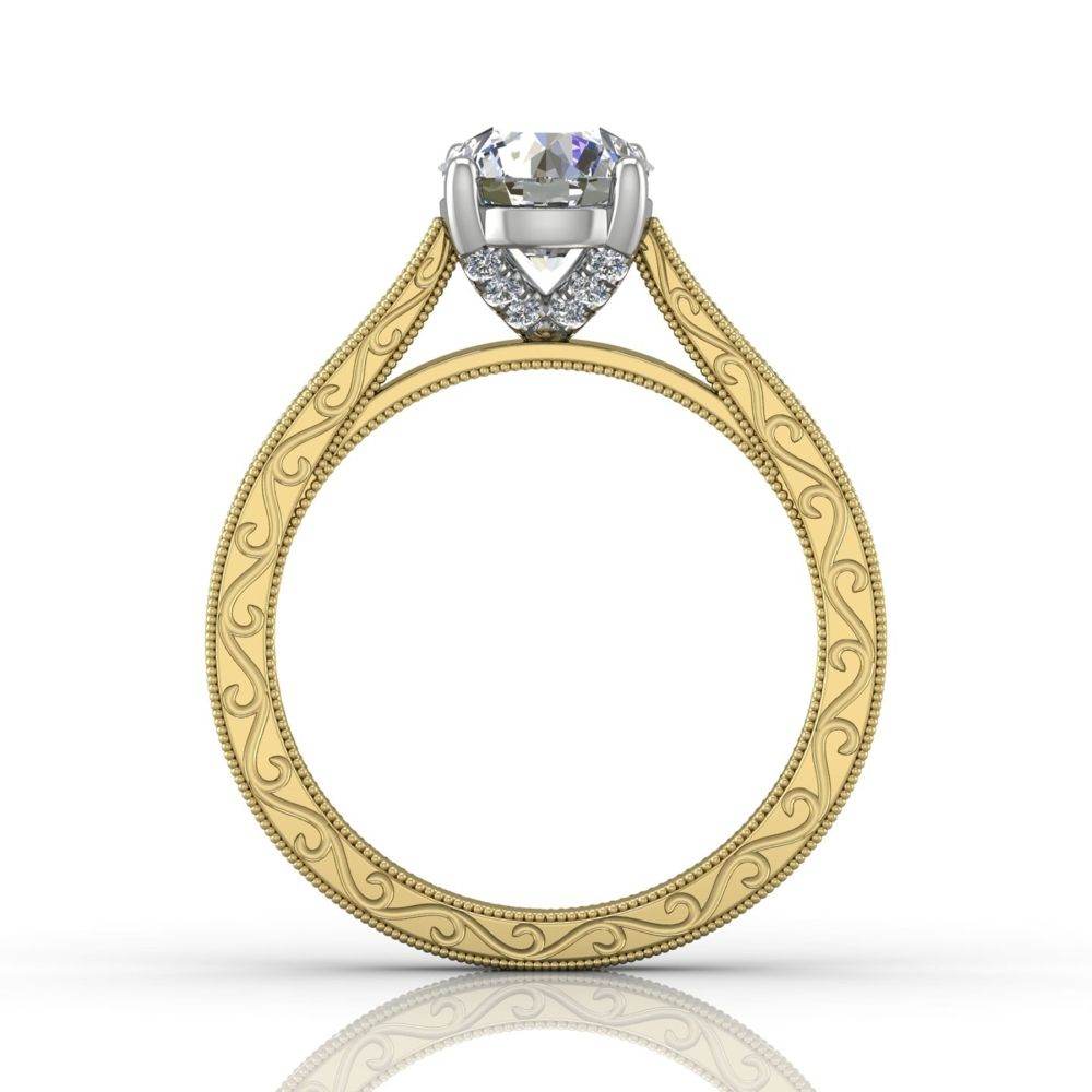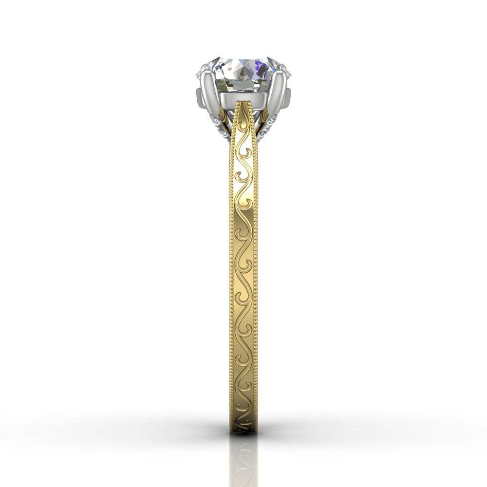 Inspired by vintage design, this 18k yellow and white gold diamond engagement ring features a hand-engraved motif throughout, framed by delicate Milgrain edges. And set with pave round brilliant-cut diamonds from both sides of the claws to perfectly accent a centre diamond of your choice.