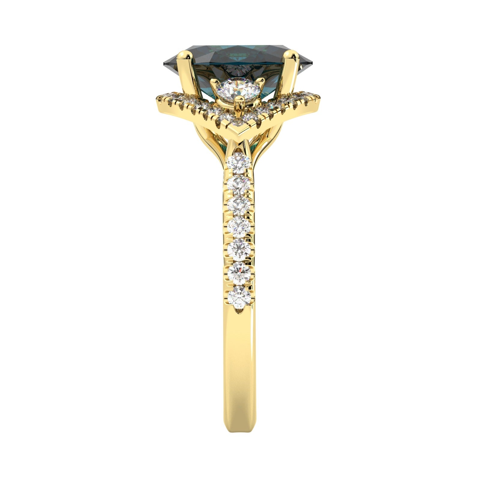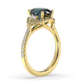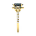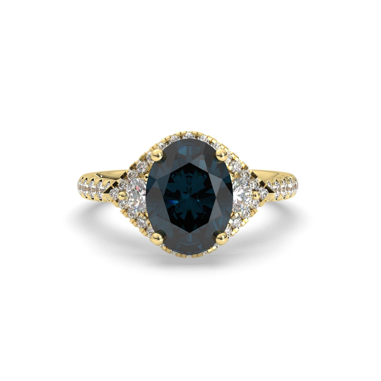 Put high style on her finger with this iconic oval sapphire and diamond ring. A statement-making deep royal blue faceted oval sapphire is encircled by round brilliant-cut diamonds set in traditional 18k yellow gold. Petite diamonds across the shoulders of the band add an extra dose of sparkle. A beautiful alternative to a diamond engagement ring.