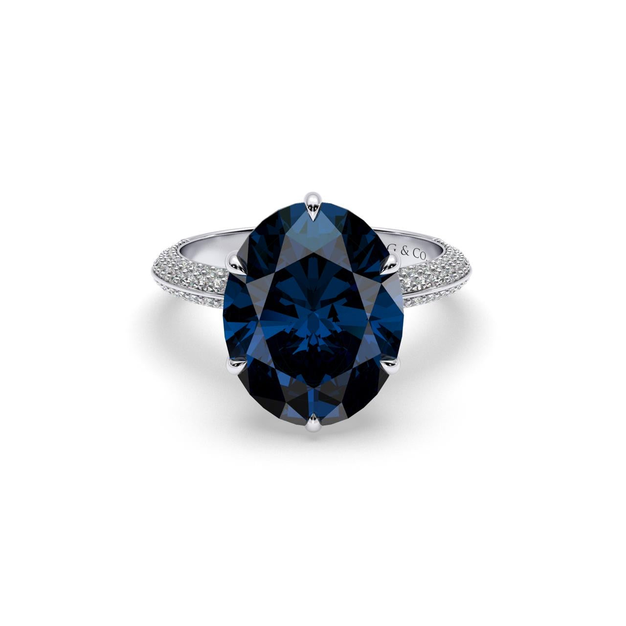 A classic but stylish choice, this elegant sapphire gemstone ring is surrounded by pavé-set diamonds framed with hidden halo.