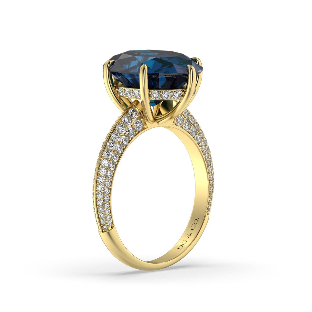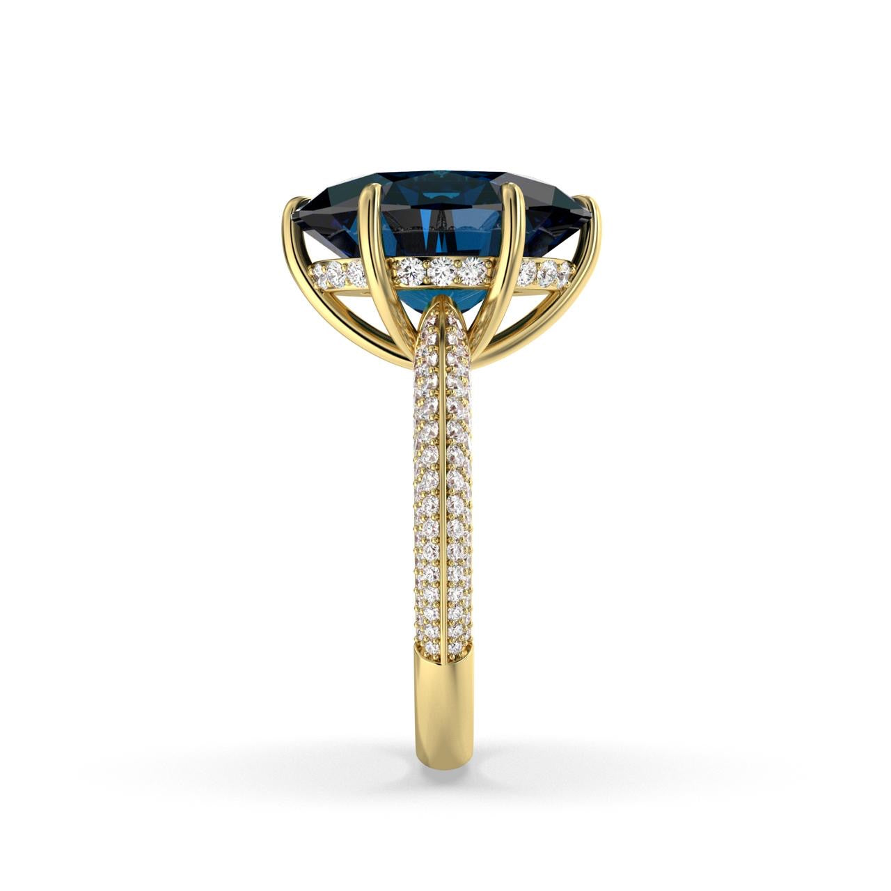 A classic but stylish choice, this elegant sapphire gemstone ring is surrounded by pavé-set diamonds framed with hidden halo.