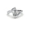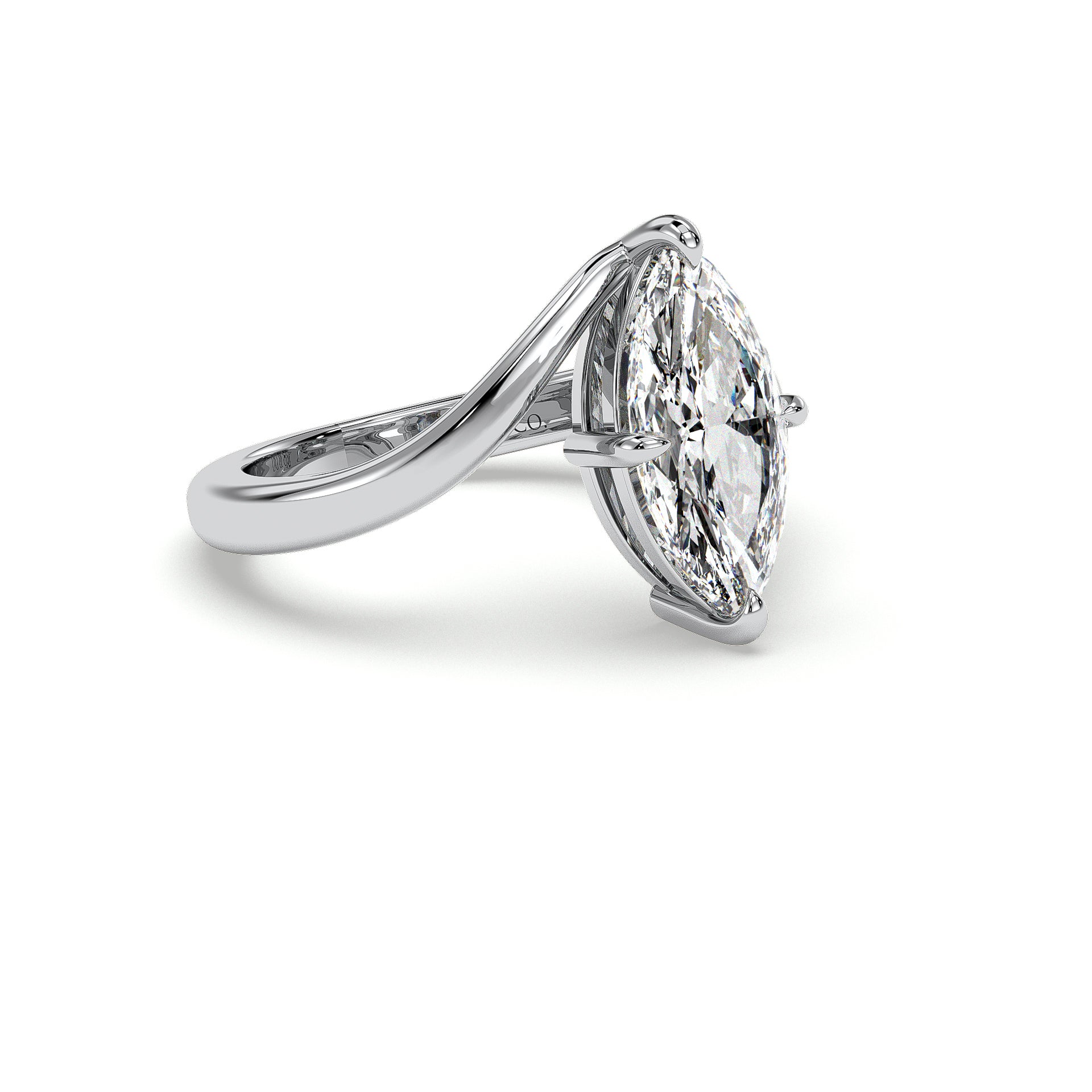 The north and south prongs of the marquise center stone setting meet the elegant and airy bypass shank. This exquisitely crafted engagement ring is delicate yet impressive.