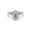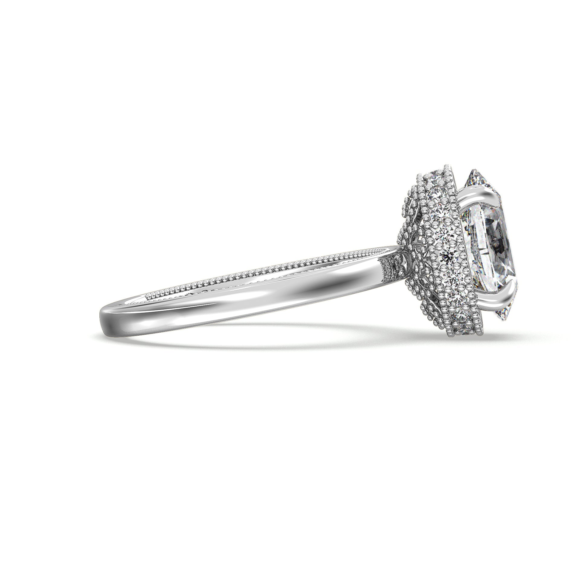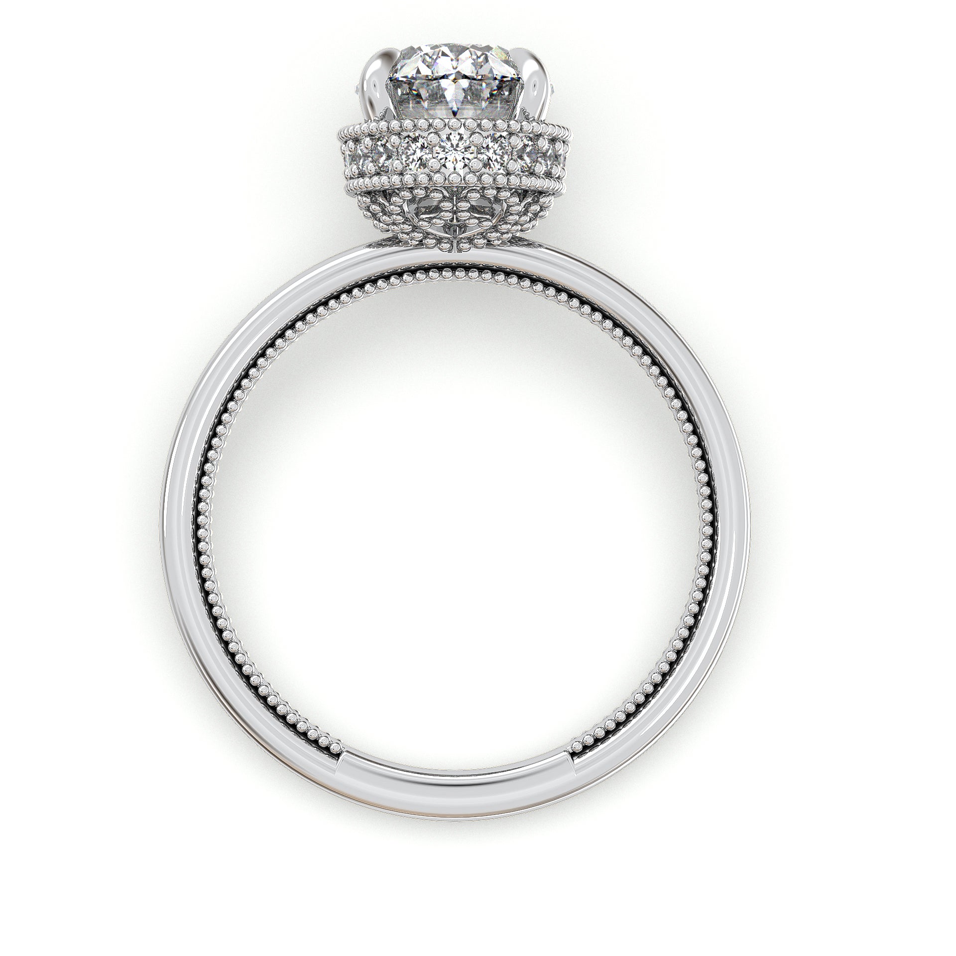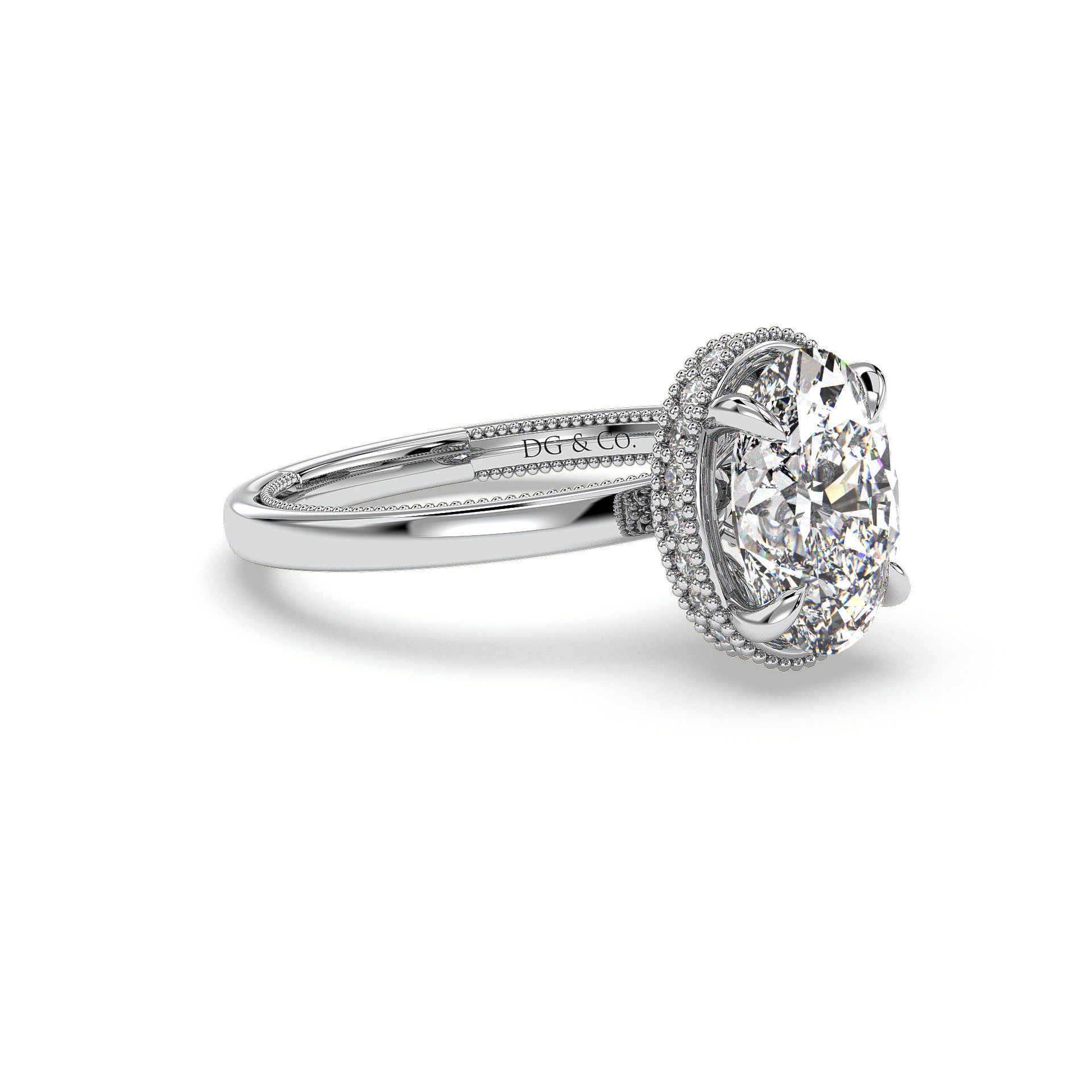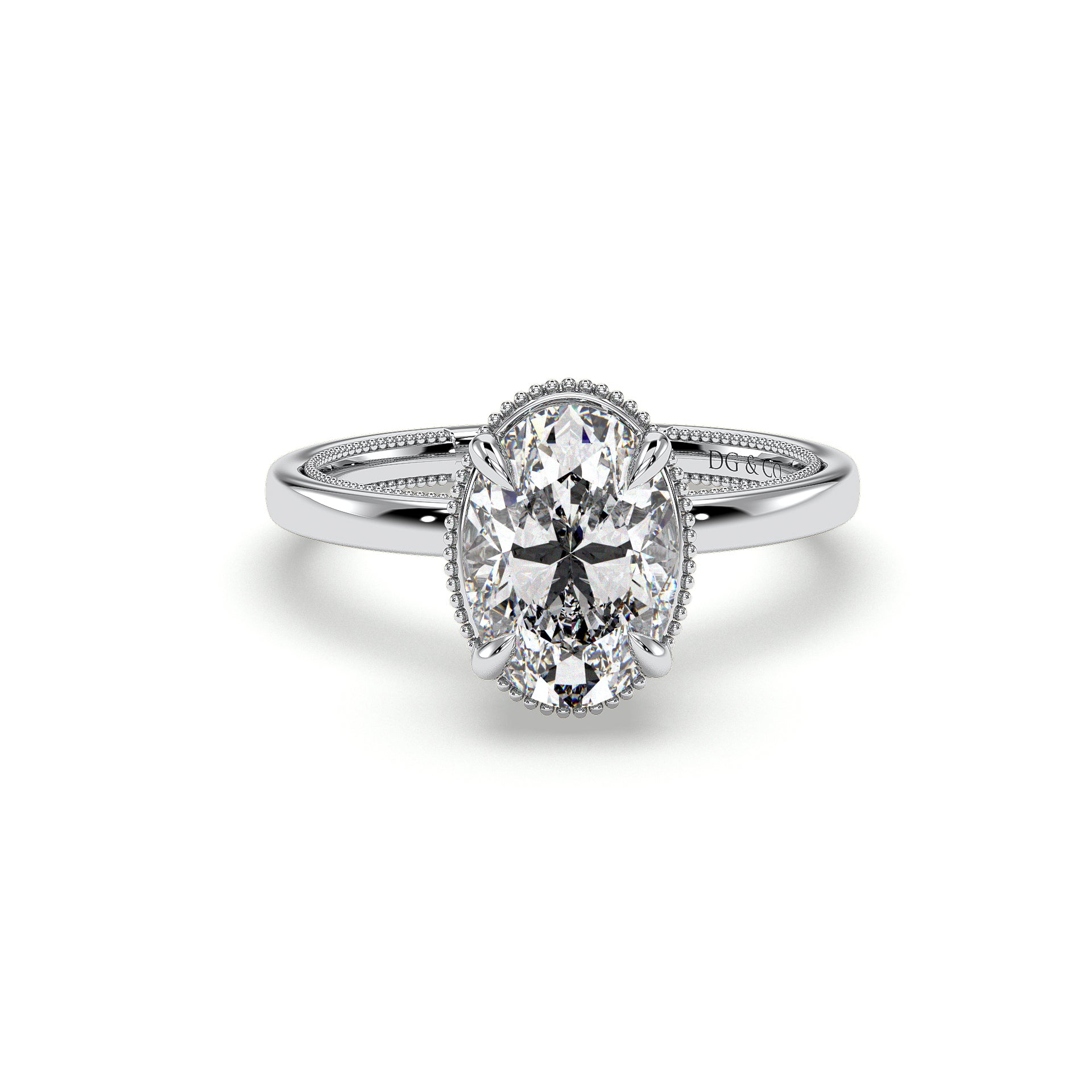 Celebrate your love story with this antique style oval cut engagement ring featuring a stunning solitaire diamond accented with hidden halo diamond details . It features gleaming miligrain unique design 3/4 of the band.