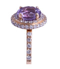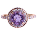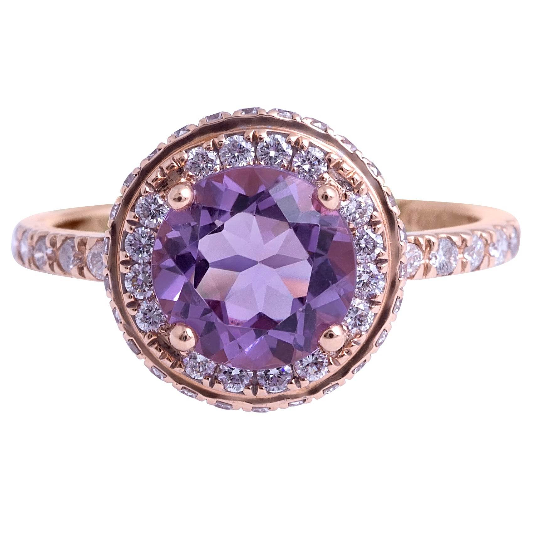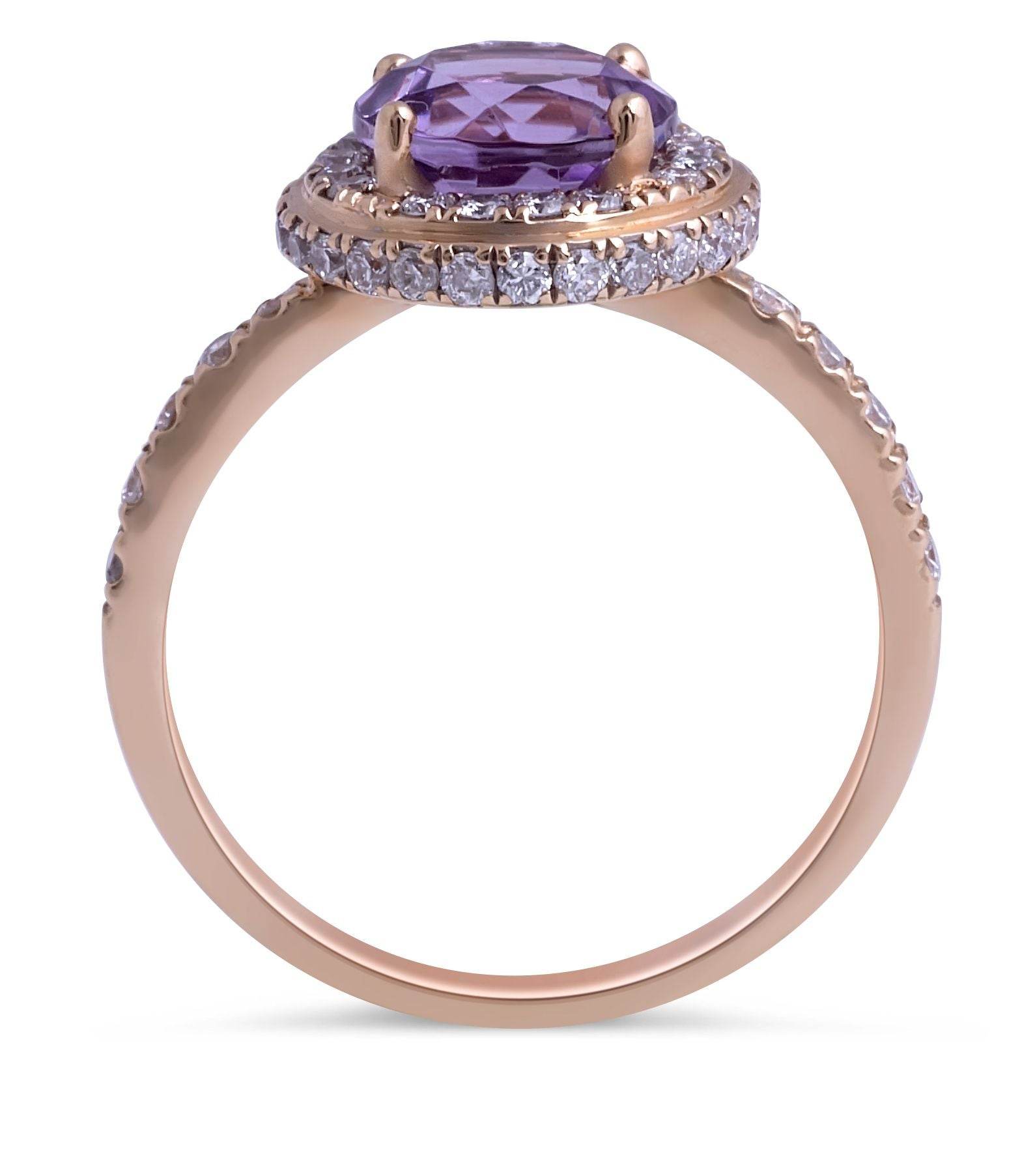 An absolute vision of elegance and beauty, this 18 Karat Rose Gold Amethyst and Diamond ring features a 1 Carat Amethyst beautifully framed by a pave set thirty round brilliant diamonds totalling 0.30 Carats.