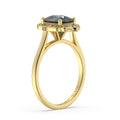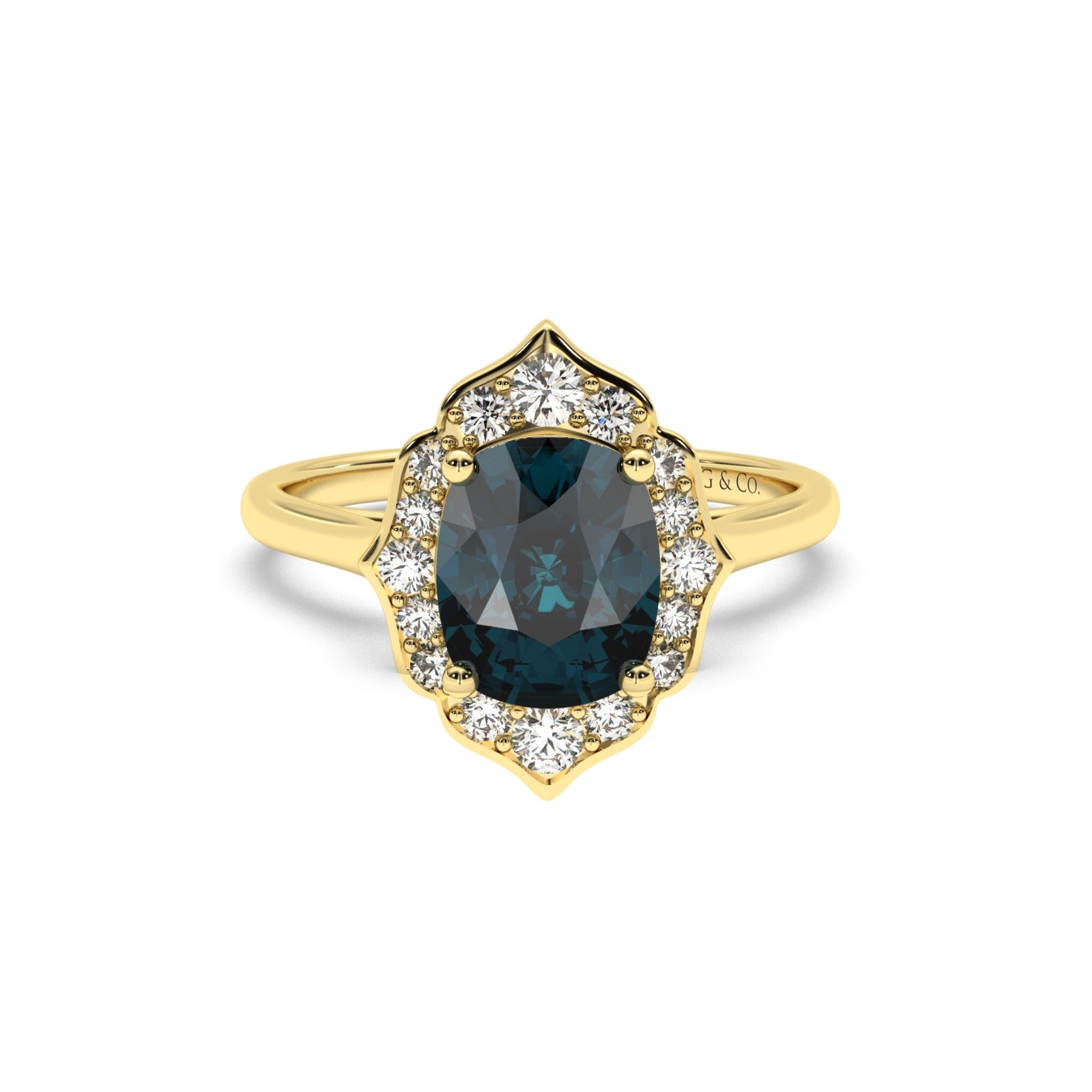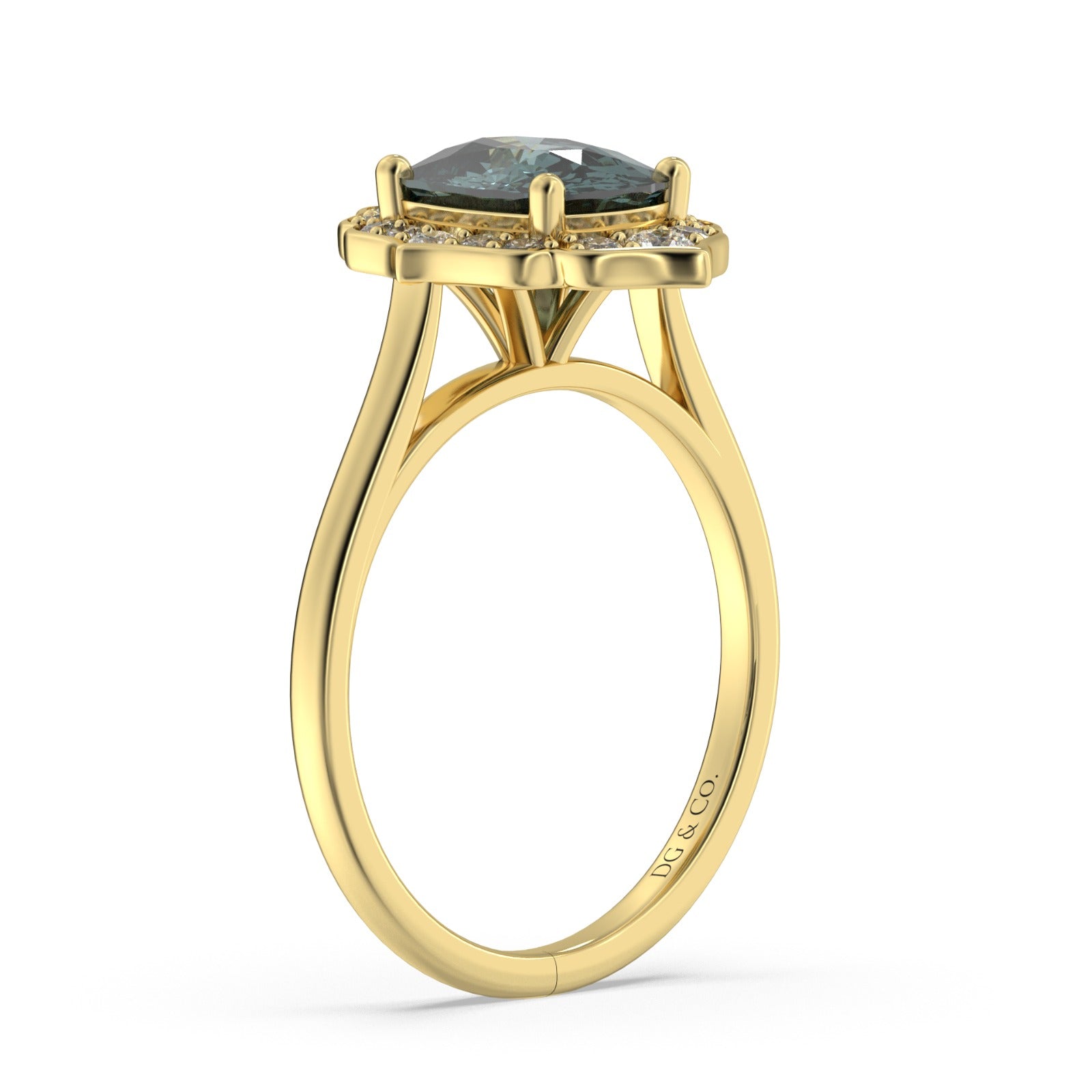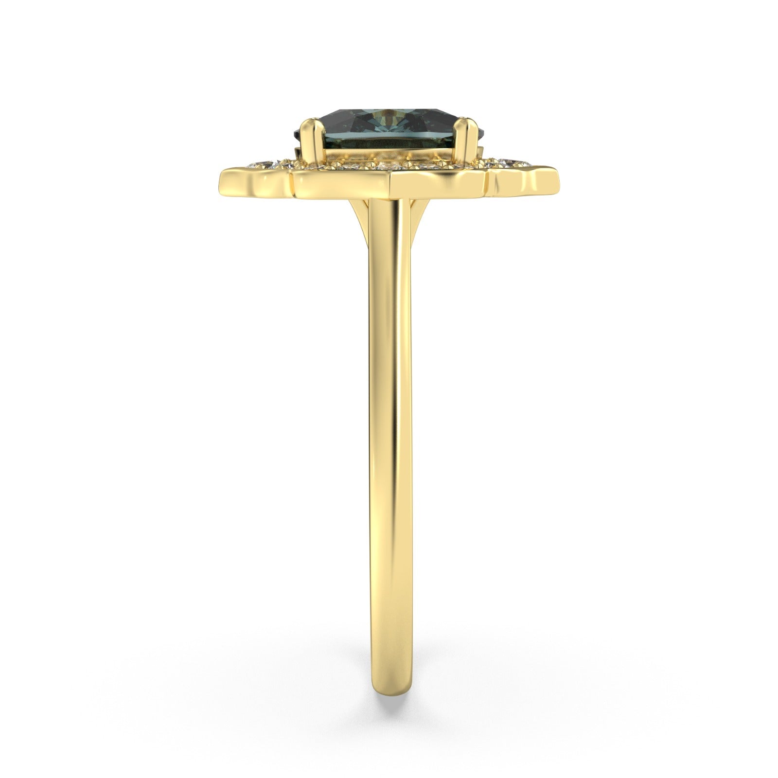 Bring gorgeous shimmer to your style as you wear this stunning ring featuring an oval-cut teal blue sapphire at its heart, surrounded by accent diamond petals. It is designed in 18k gold that promises enduring luxurious quality.
