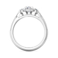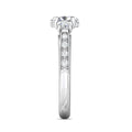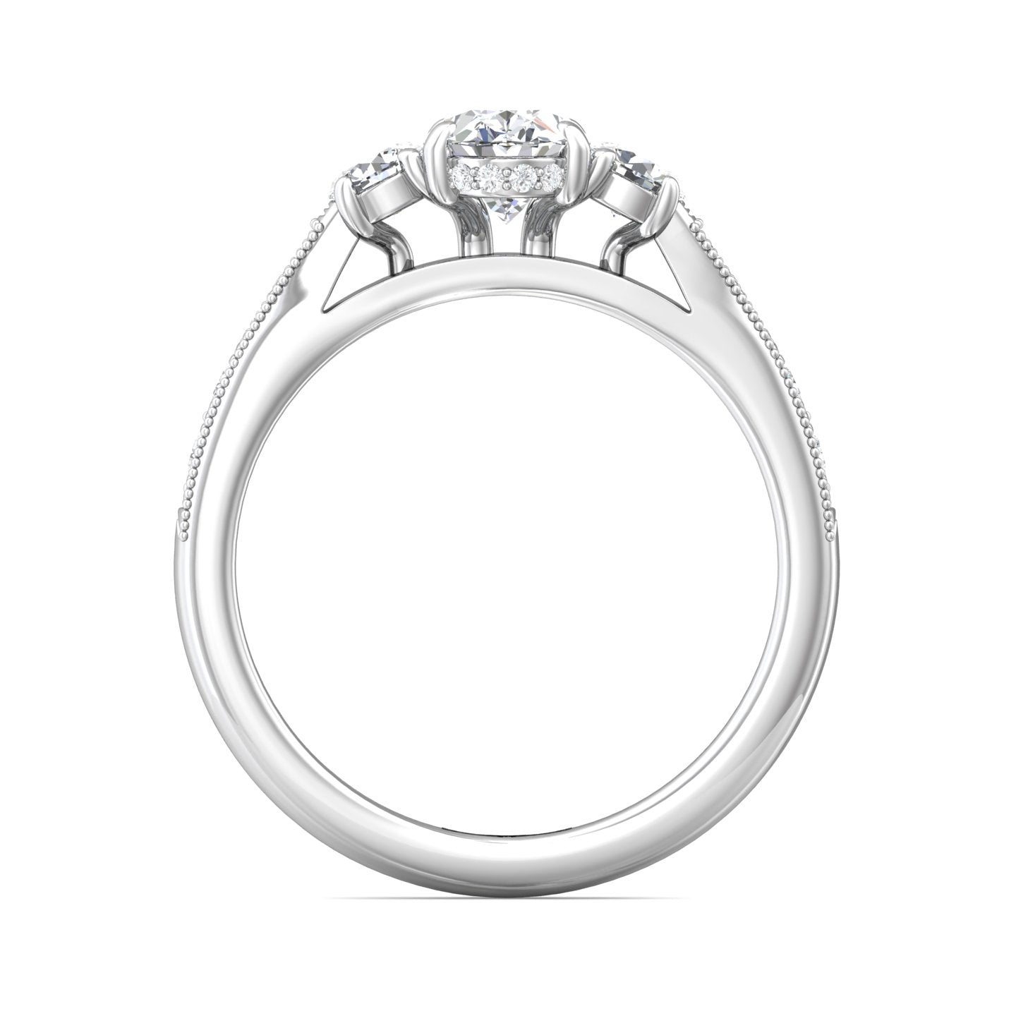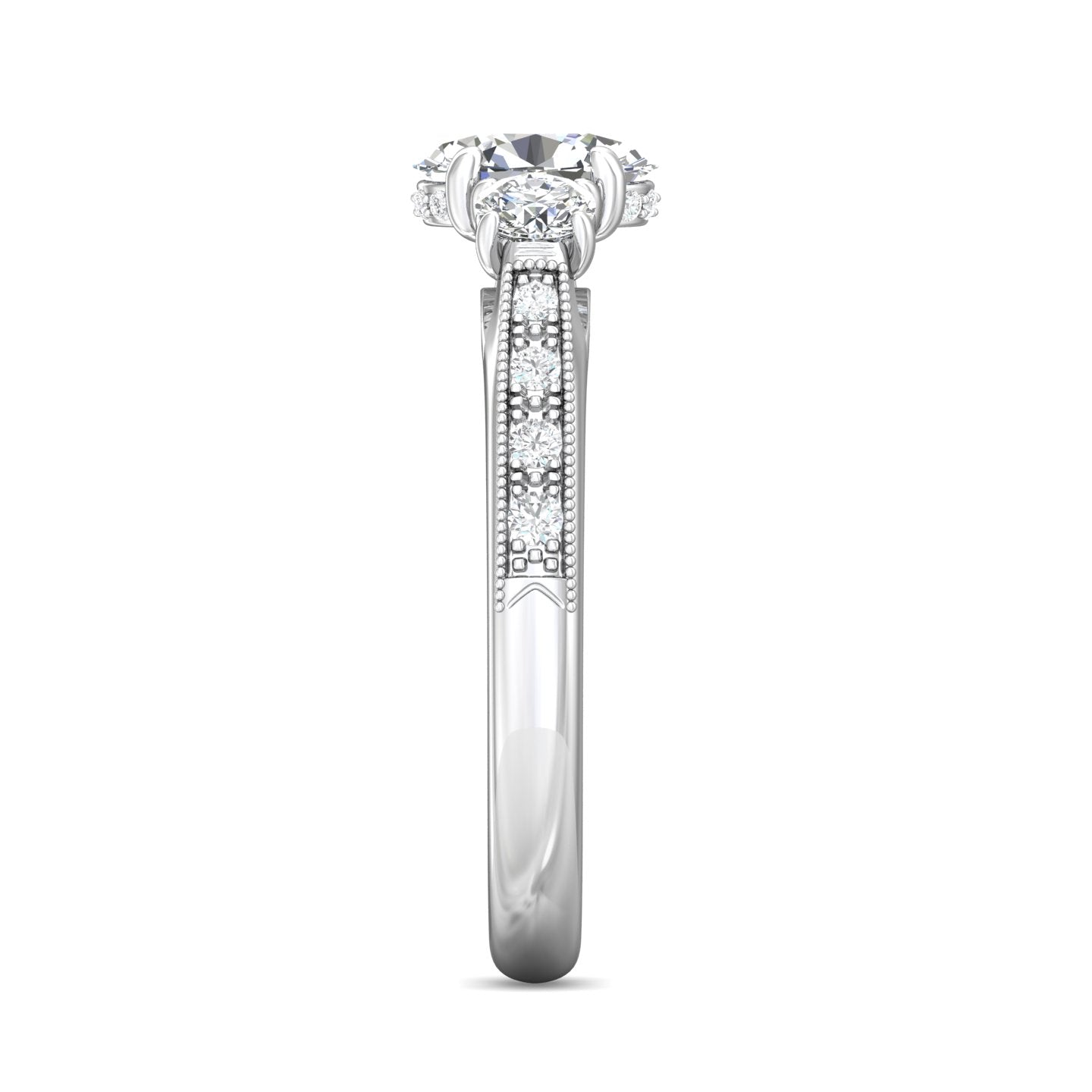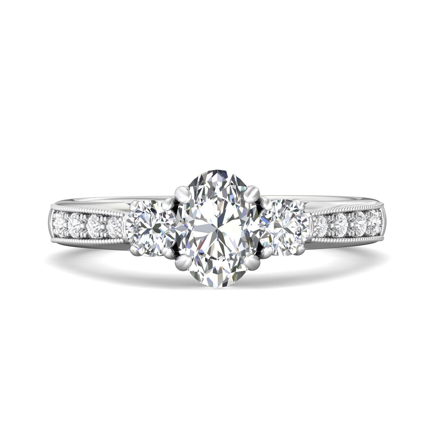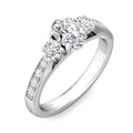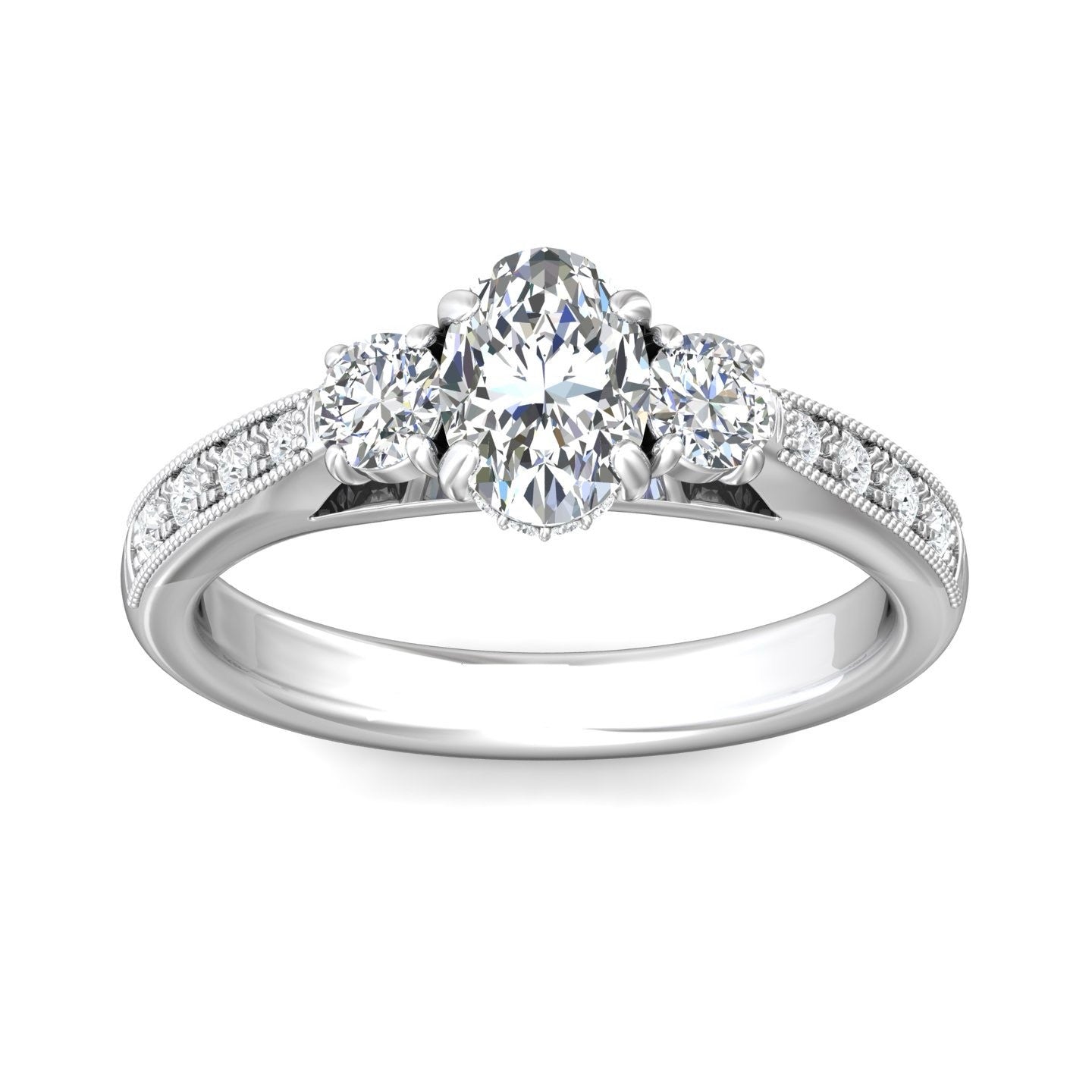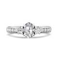 A stunning symbol of love, this engagement ring features beautiful round-cut diamonds framing the centre oval stone, and shimmering pave-set diamonds sparkling along the shank. The design features a hidden halo with a vintage-inspired milgrain detail.