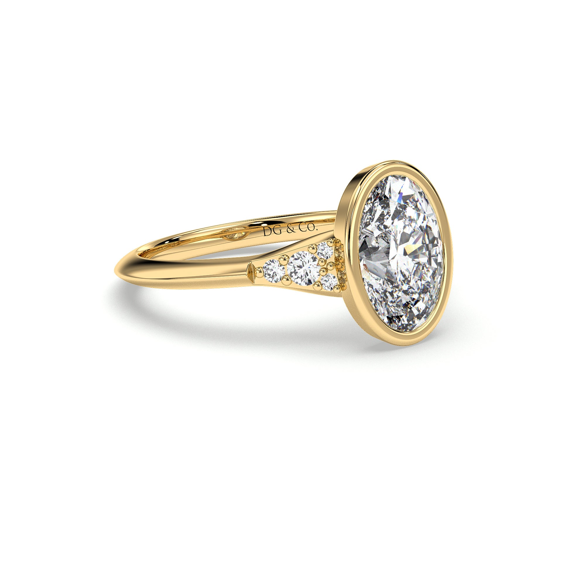 Showcase a promise of forever with this oval cut diamond accent bezel engagement ring. It combines a bezel set center diamond with side stone claw set diamond accents for safety standout style.