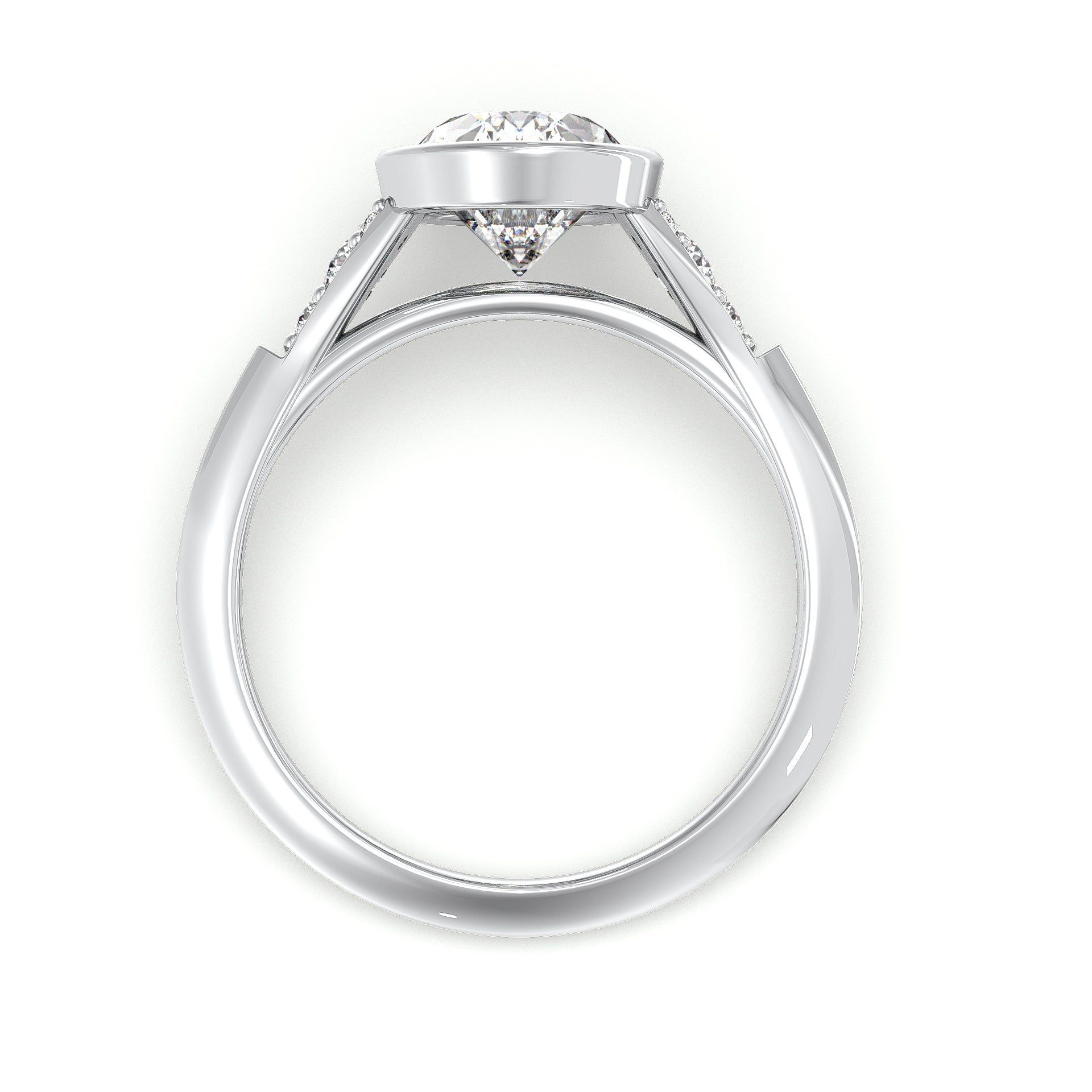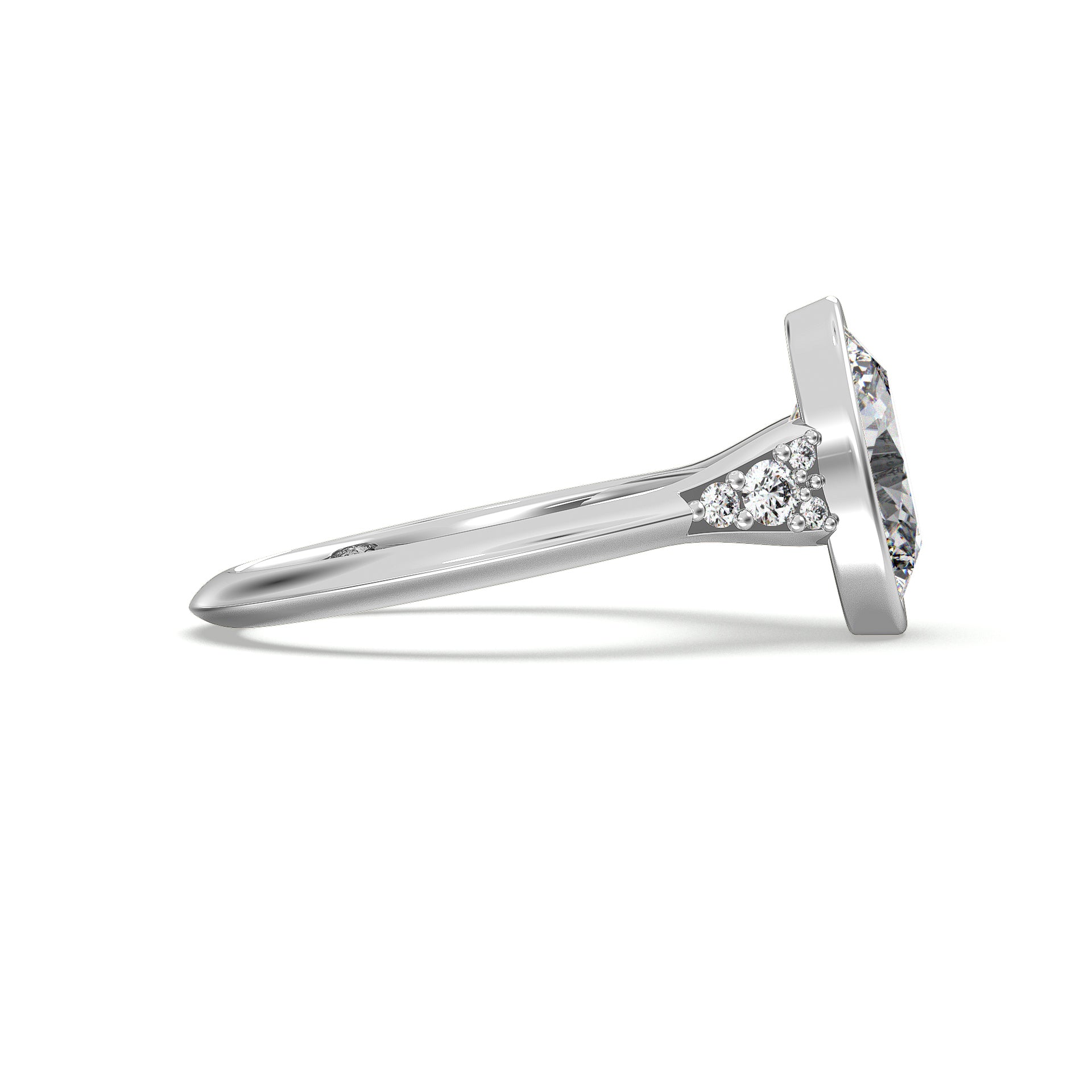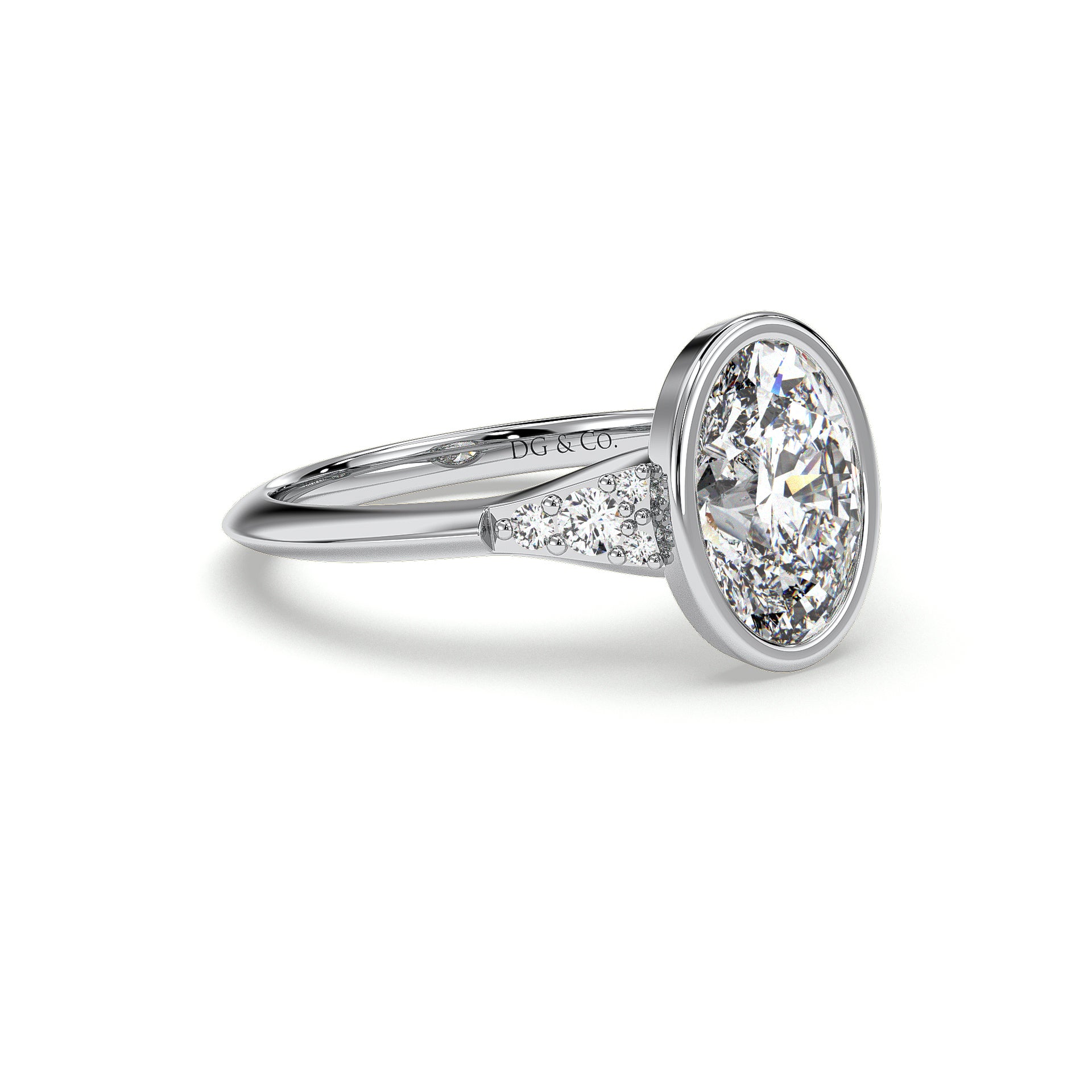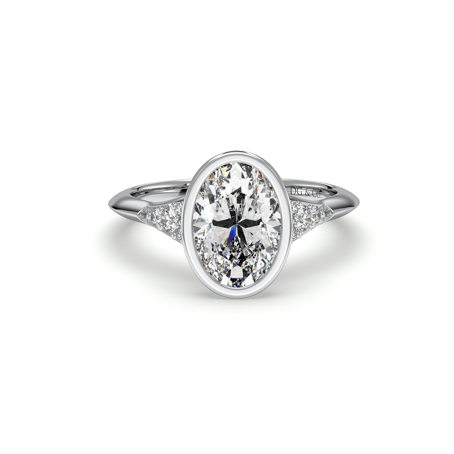 Showcase a promise of forever with this oval cut diamond accent bezel engagement ring. It combines a bezel set center diamond with side stone claw set diamond accents for safety standout style.