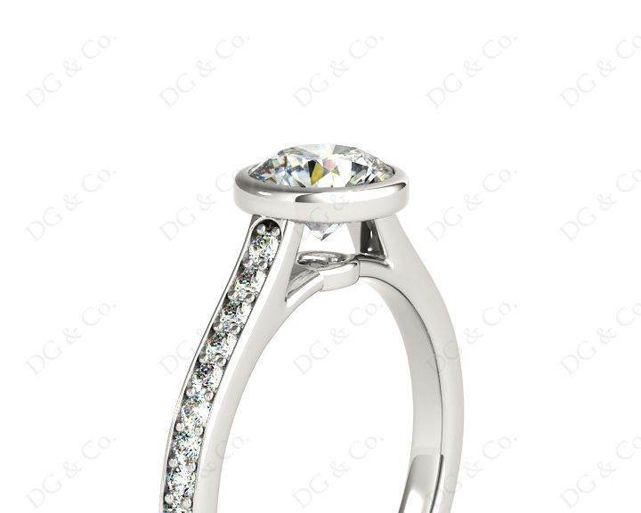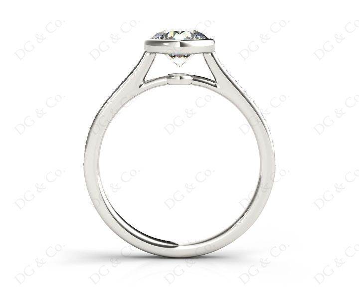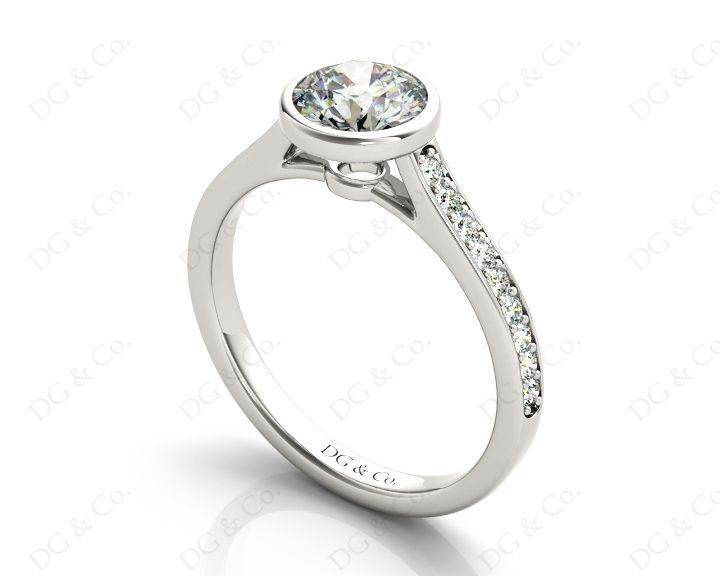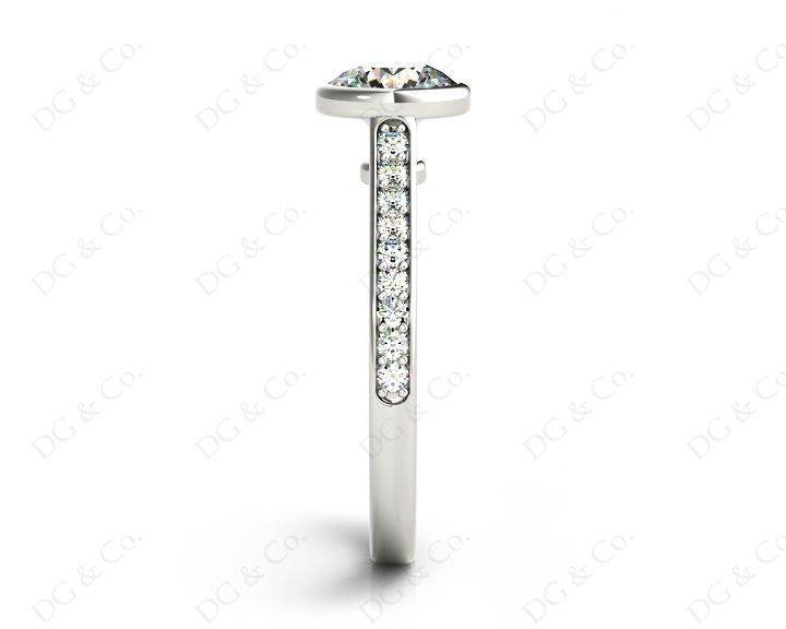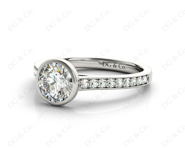 Engagement Ring with a Round Cut Diamond Bezel set in the centre and Eighteen brilliant Cut Diamonds Channel Set into the Shoulders.
