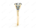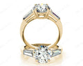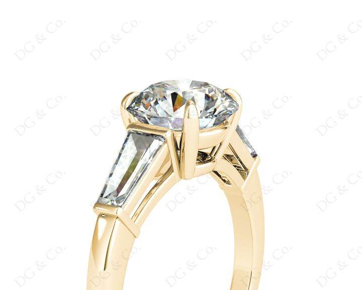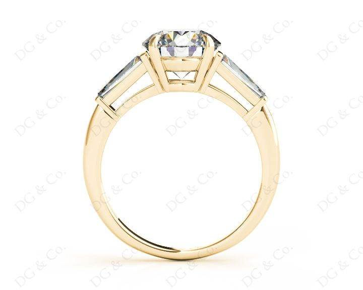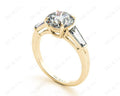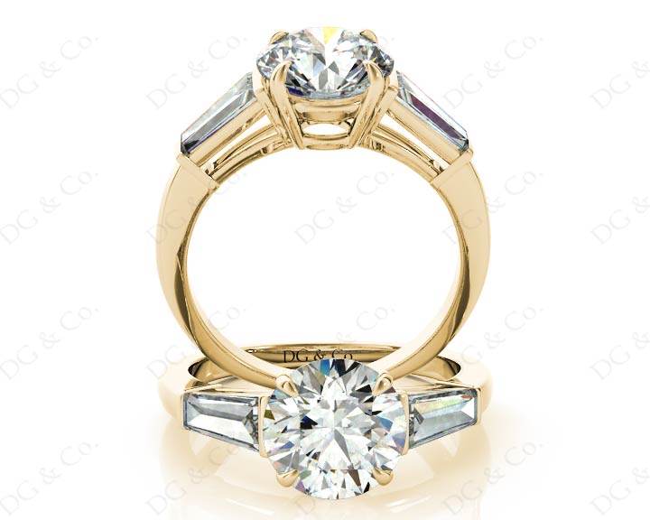 Three Stones Engagement Ring with a Round Cut Diamond in a Claw Setting with Two Tapered Baguette Diamonds Bar Setting in to the Shoulders.