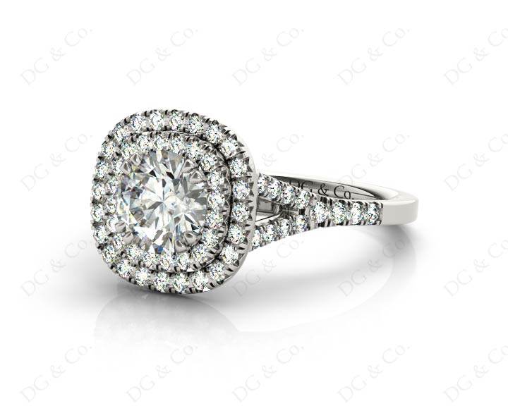Diamond Engagement Ring with Round Cut Diamond. Pave Set Double Halo and Stones Down the Shoulders on Split Band.
