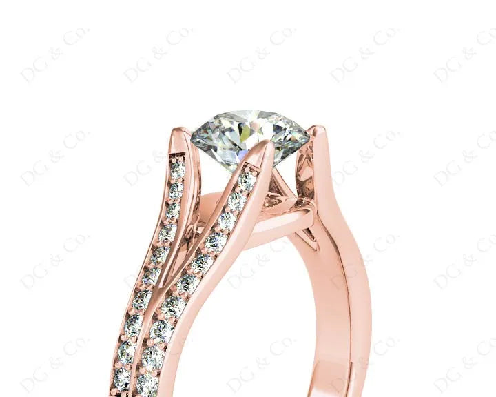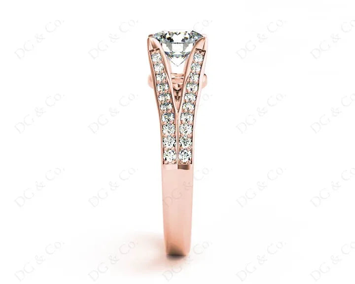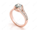 Diamond Engagement ring with four claws set centre stone split band setting with forty round brilliant cut diamonds grain set in to the band.