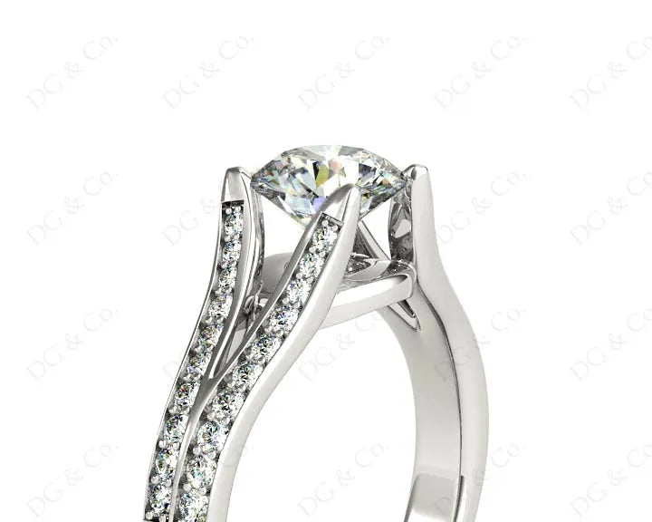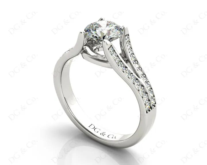 Diamond Engagement ring with four claws set centre stone split band setting with forty round brilliant cut diamonds grain set in to the band.