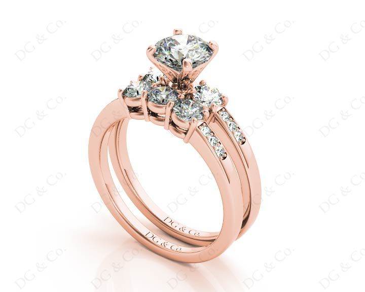 Three stones wedding set diamond rings with brilliant cut diamond four claws set in the centre and eight brilliant cut diamonds set in to the band and nine diamonds claw and channel set in to the wedding band.