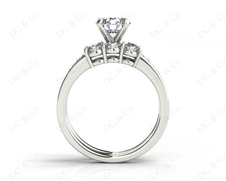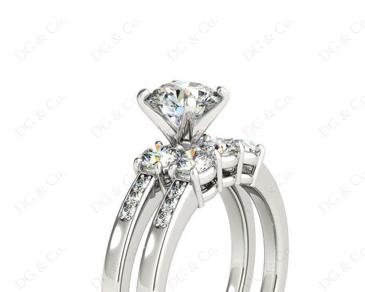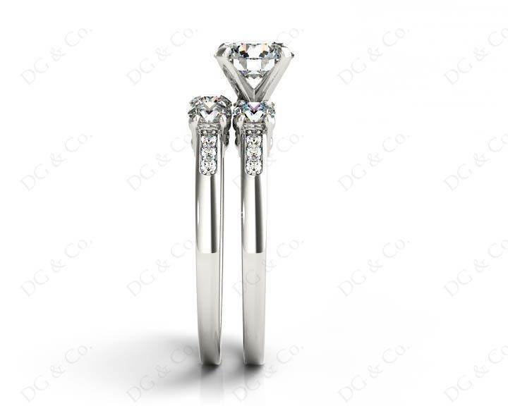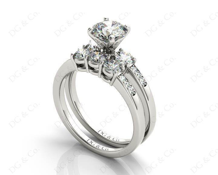 Three stones wedding set diamond rings with brilliant cut diamond four claws set in the centre and eight brilliant cut diamonds set in to the band and nine diamonds claw and channel set in to the wedding band.