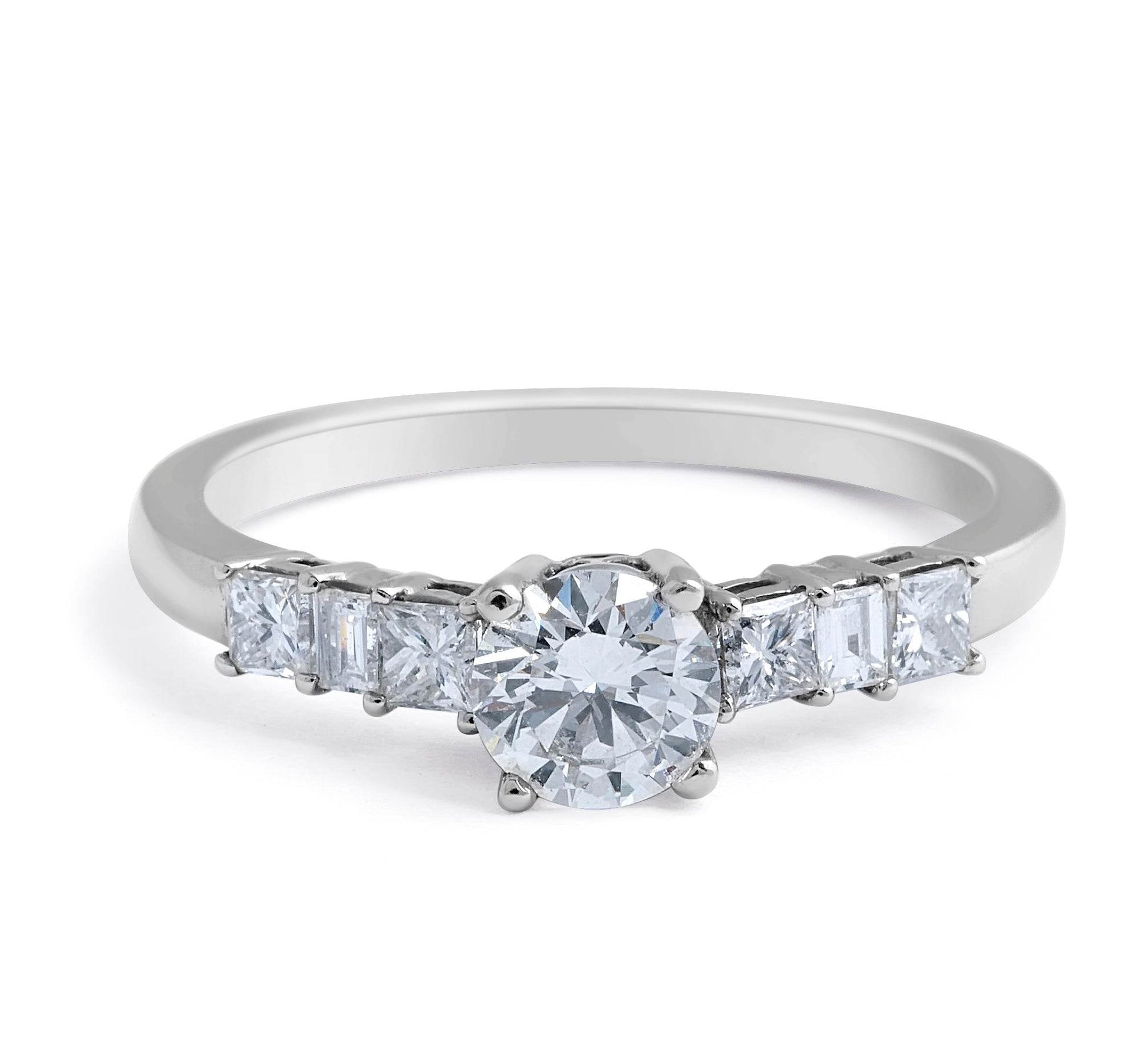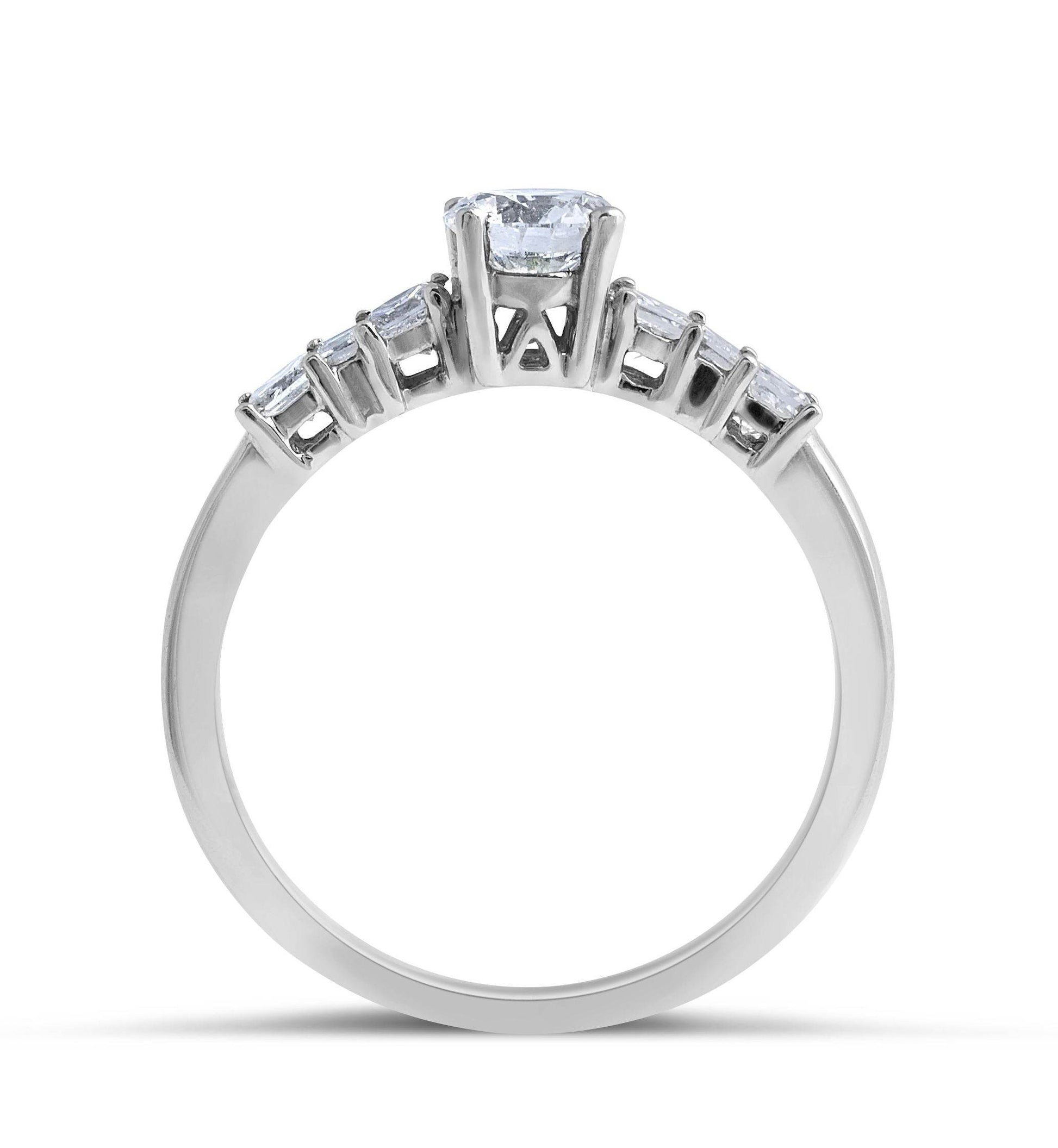 This modern classic 18K white gold diamond engagement ring has a beautiful eye clean 0.50ct round brilliant cut diamond in F colour as a centre stone. The band has four princess and two baguette cut diamonds on band. The diamonds are set with four claws so that the profile of each beautiful diamond is always on show to be enjoyed. The setting is also designed for the diamonds to pick up light for the most gorgeous sparkle. This ring suits a woman who enjoys delightful sparkle in every day of her life - a gorgeous diamond for every day of the week.