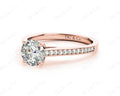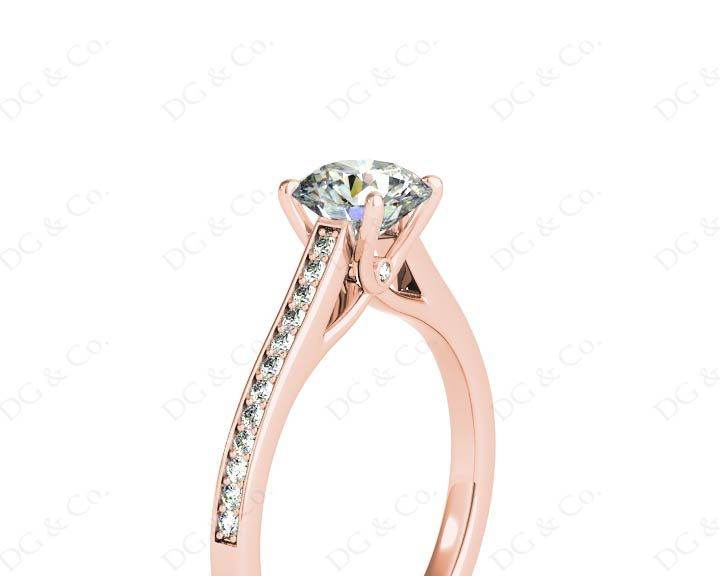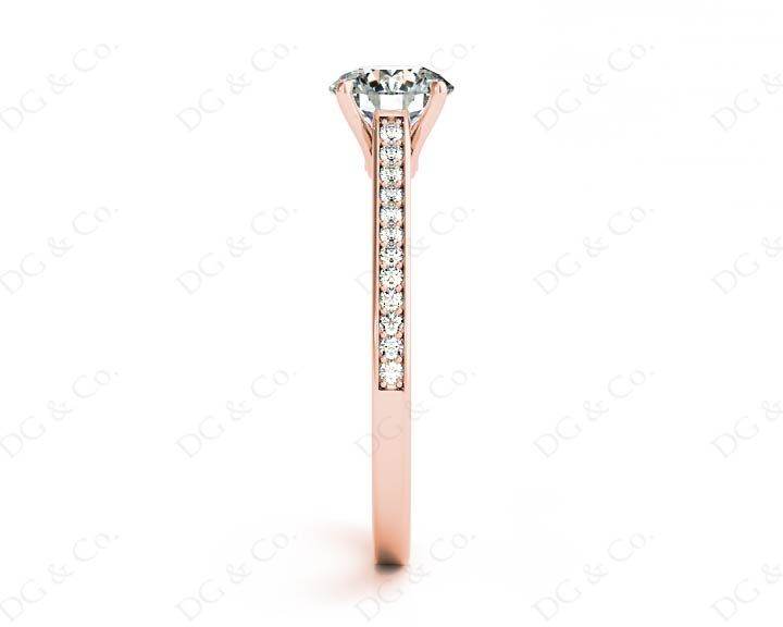 Round Round Cut Four Claw Set Diamond Engagement Ring with Round Cut Diamonds Channel Set Down the Shoulders and Round Cut Diamonds Bezel Set on Both Sides of the High Setting.