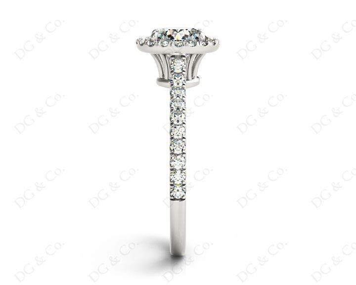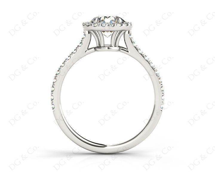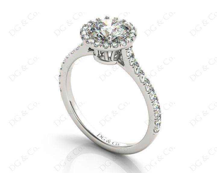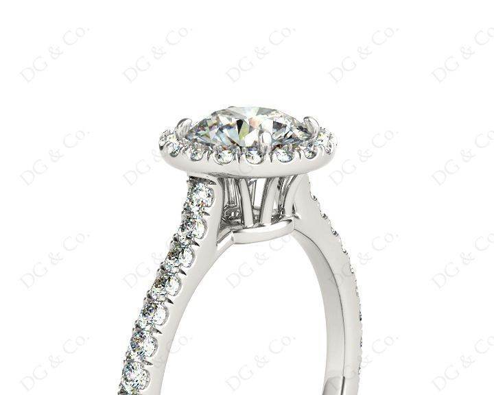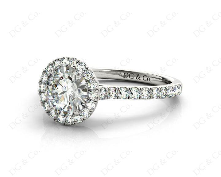 Halo Diamond Engagement Ring with Round Cut Diamond in Four Claws Setting with Thirty- Eight Round Round Pave Setting around the Centre Stone and Down the Shoulders.