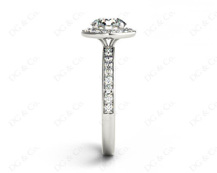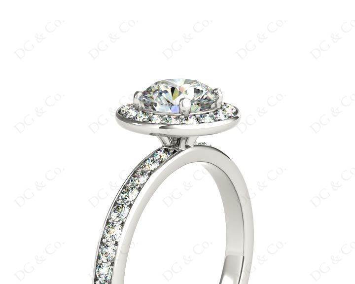 Halo diamond engagement ring with brilliant cut diamond four claws setting and thirty-six diamonds channel setting around the centre stone and down the shoulders.