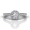 This 18k white gold vintage-inspired ring features a round halo of pave diamonds surrounding your centre diamond, as well as trails of diamonds down each side of the shank. Decorative hand-engraved details add the perfect finishing touch.