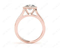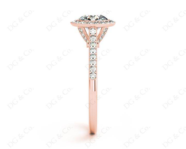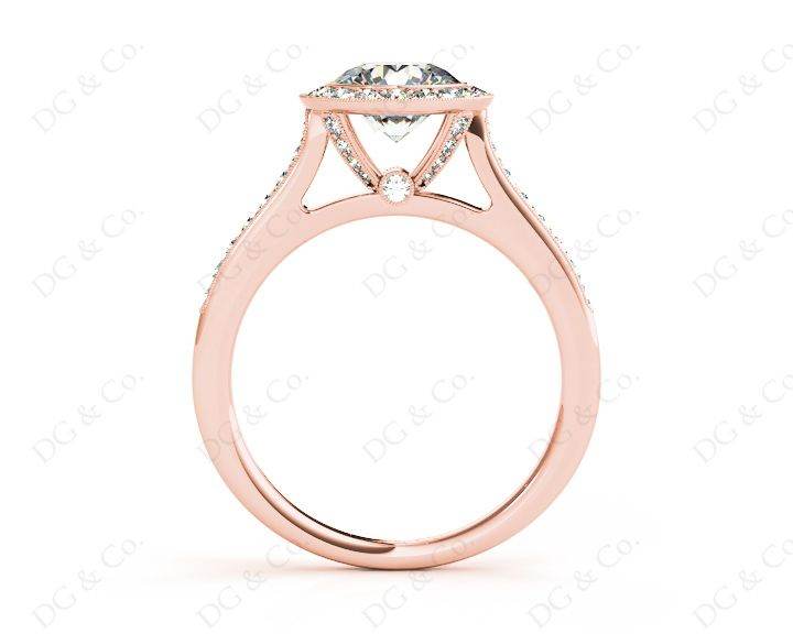 Halo Engagement Ring with a Round Cut Diamond in a Bezel Setting with Small Round Cut Diamonds Millgrain Set around the Centre Stone and Down the Shoulders.