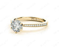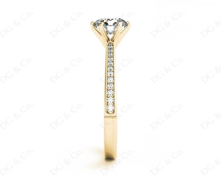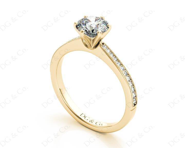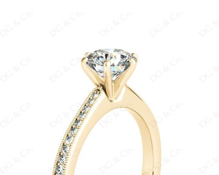 Round Cut Six Claw Set Diamond Engagement Ring with Round Cut Diamonds Pave Set on a Miligrain Feature Band.