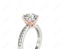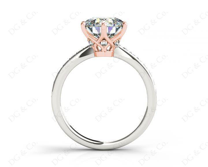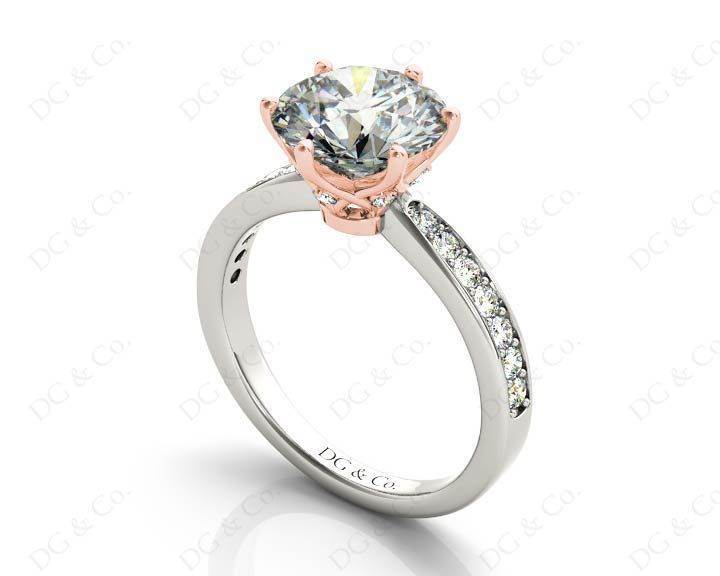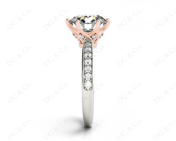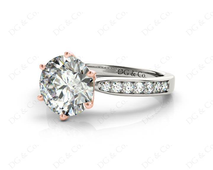 Diamond Engagement Ring With Round Cut Diamond and Six Claw Setting with Pave Set Diamonds Down the Shoulders.