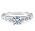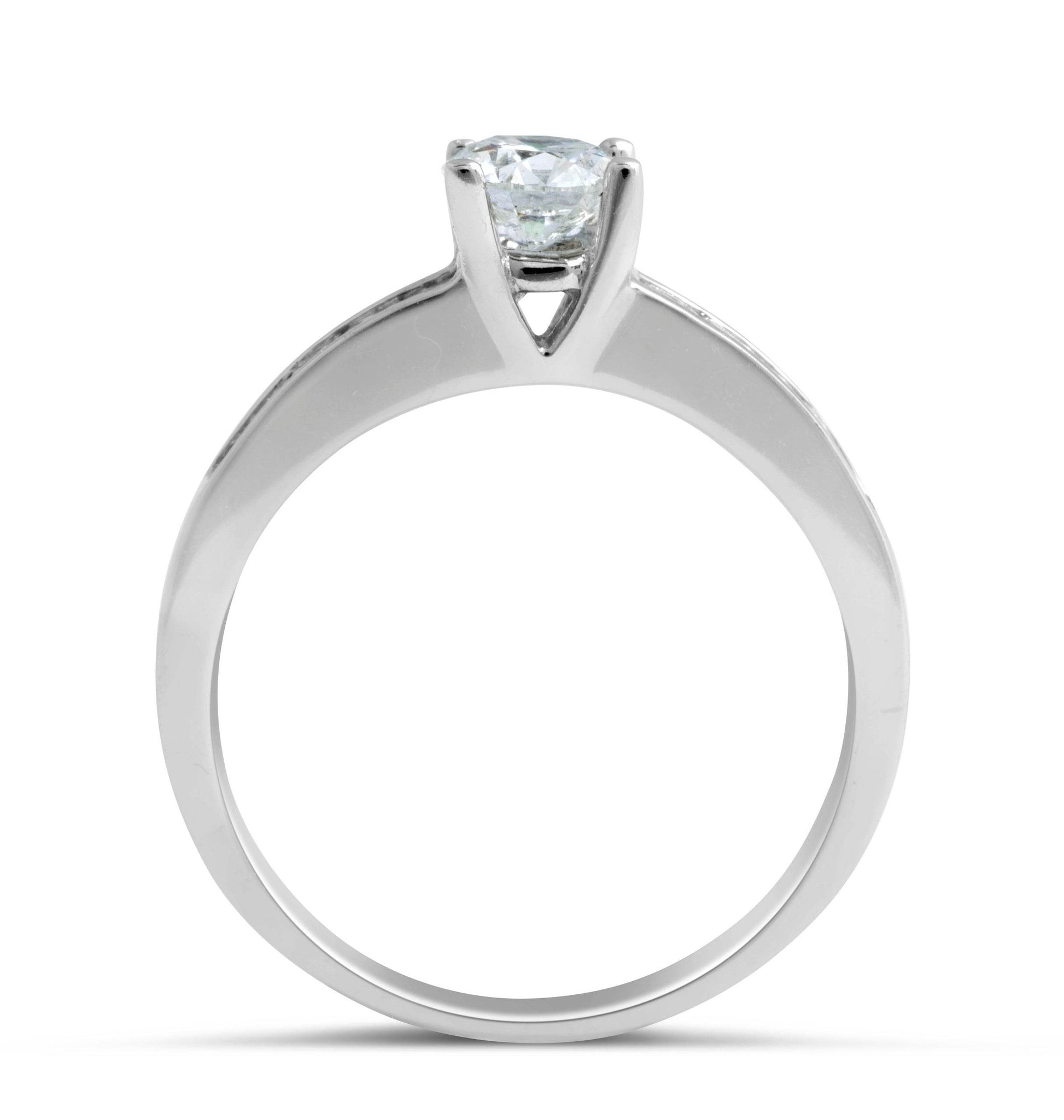 This classic 18 Karat white gold diamond engagement ring has a 0.50 carat round brilliant cut centre diamond in the highest quality colour D. A four claw setting allows a wonderful view of the beautiful diamond and creates a floating effect to accentuate the perfect colour of it. Channel set princess cut diamonds on the band create a sleek look to the ring. This ring is perfect for a woman of modern style and who appreciates high quality choices.
