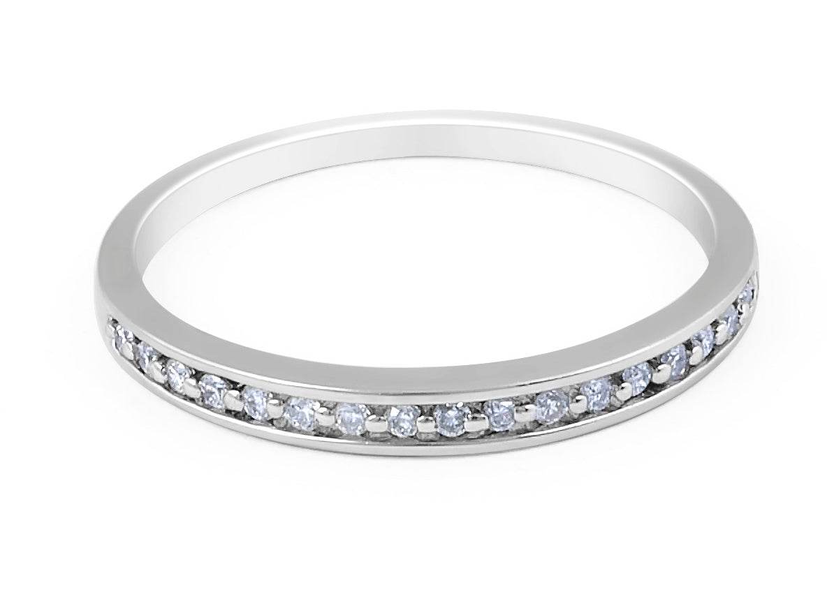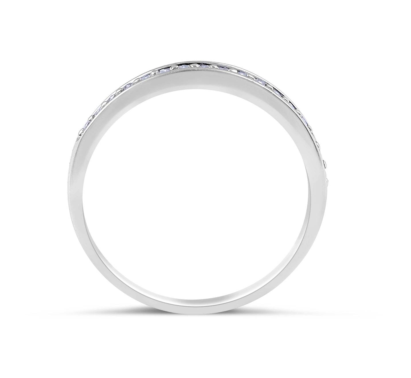 Modern design 18 Karat white gold diamond wedding band elegantly set with 17 round brilliant diamonds totalling 0.11 carat in a channel setting. The slim band with intricately set diamonds gives this ring a fine and elegant finish!