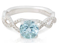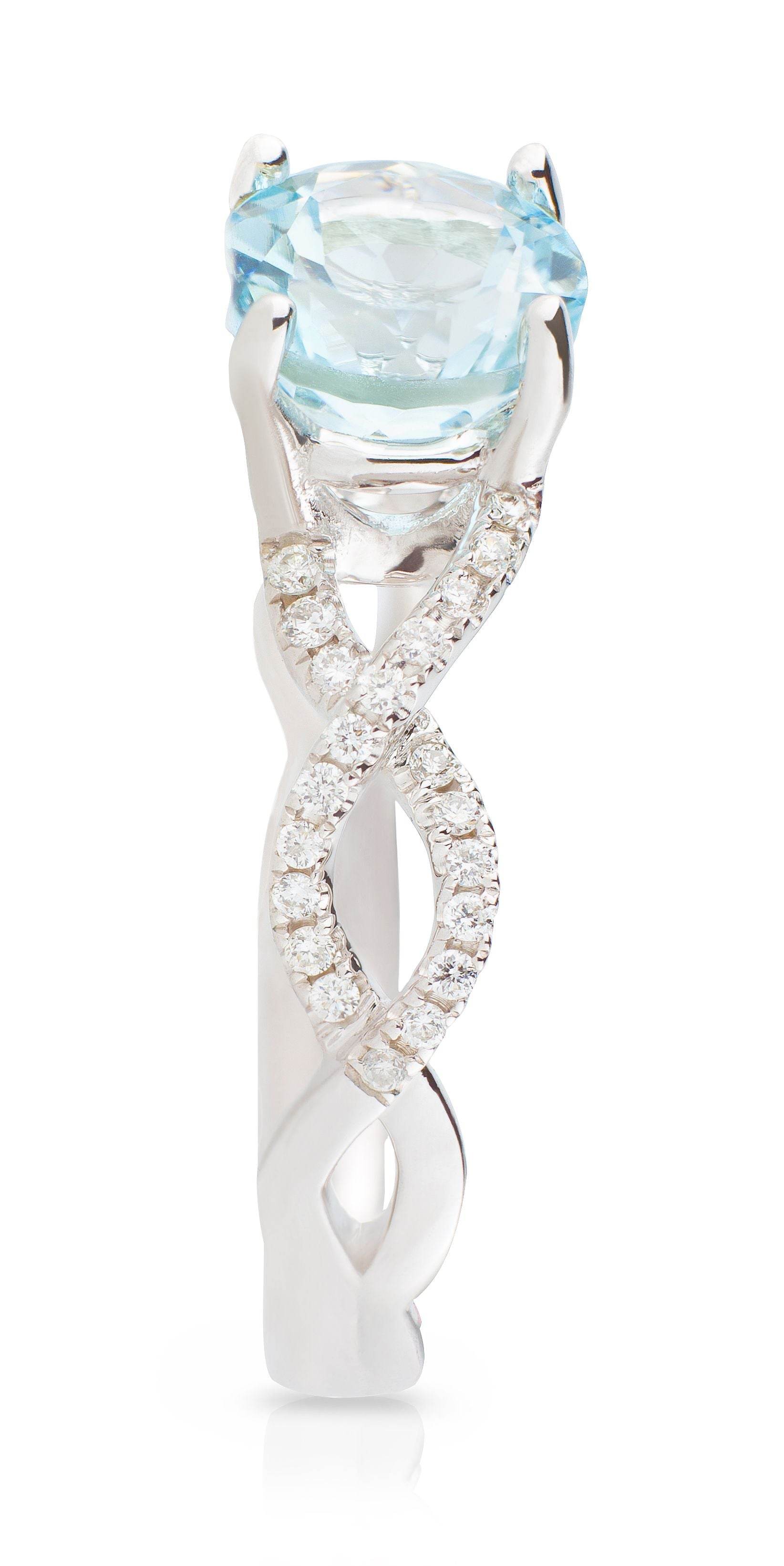 A vision of colour, this gemstone ring features a round brilliant cut aquamarine accented by pave set round brilliant diamonds in an infinity twist design of