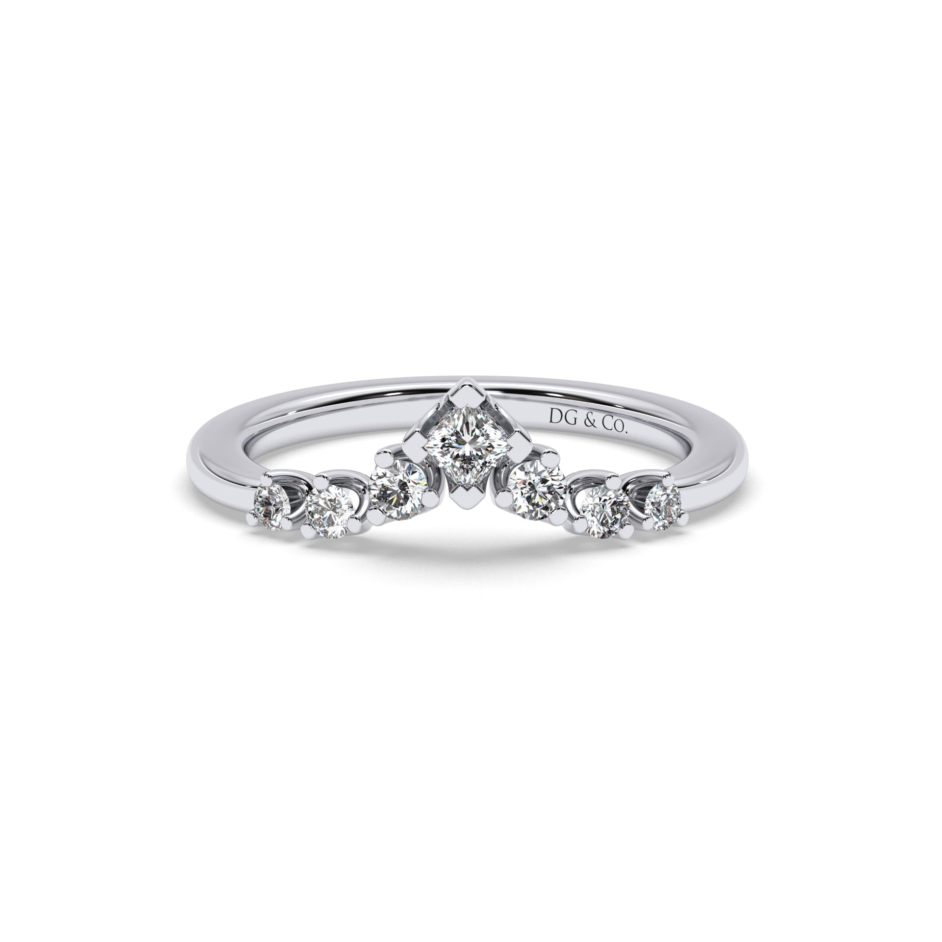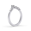 A subtle sweetheart curve creates a swell of sparkle as this ring reflects its light from every facet of its diamond trim.