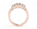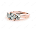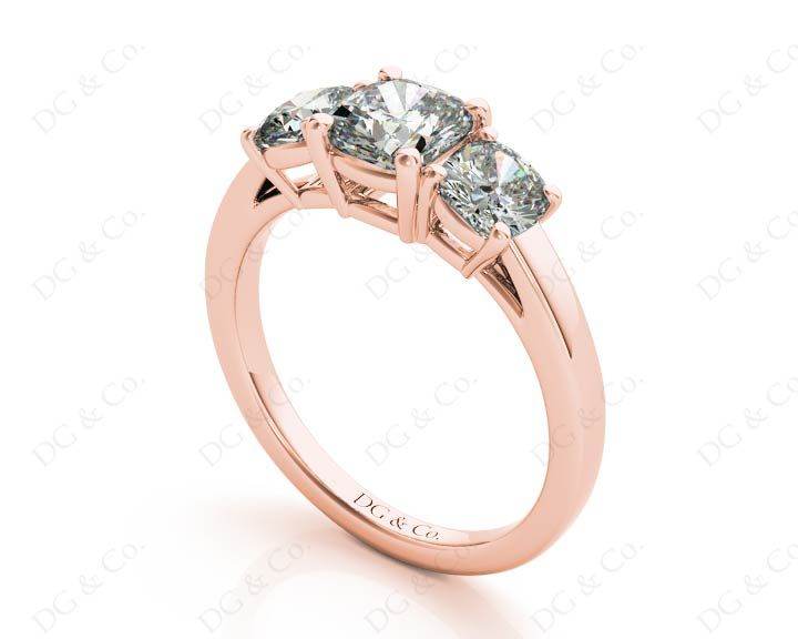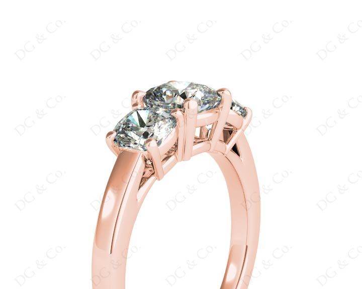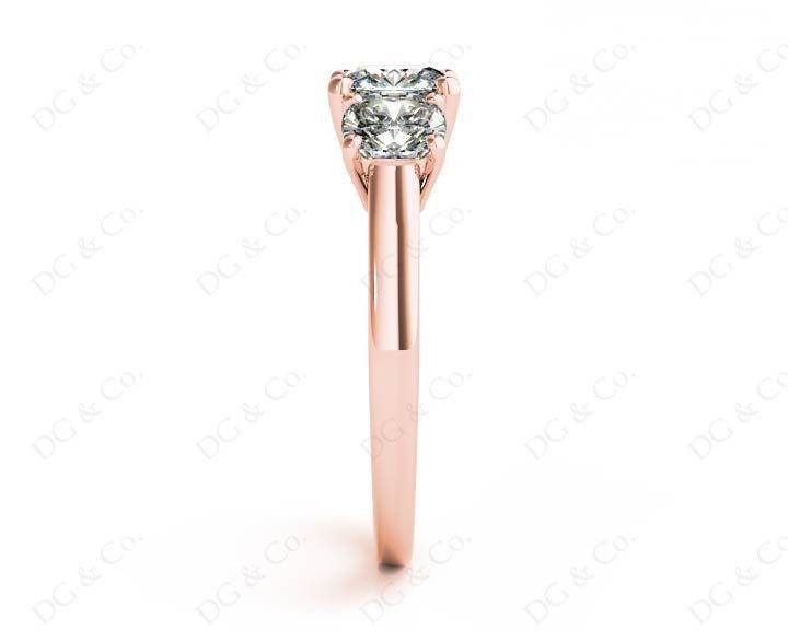 Three-stone engagement ring with three cushion cut diamonds in four claw settings with a square band.