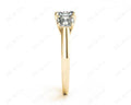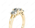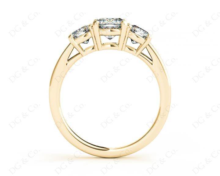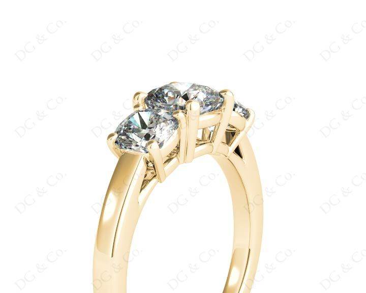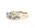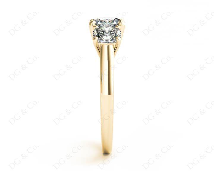 Three-stone engagement ring with three cushion cut diamonds in four claw settings with a square band.