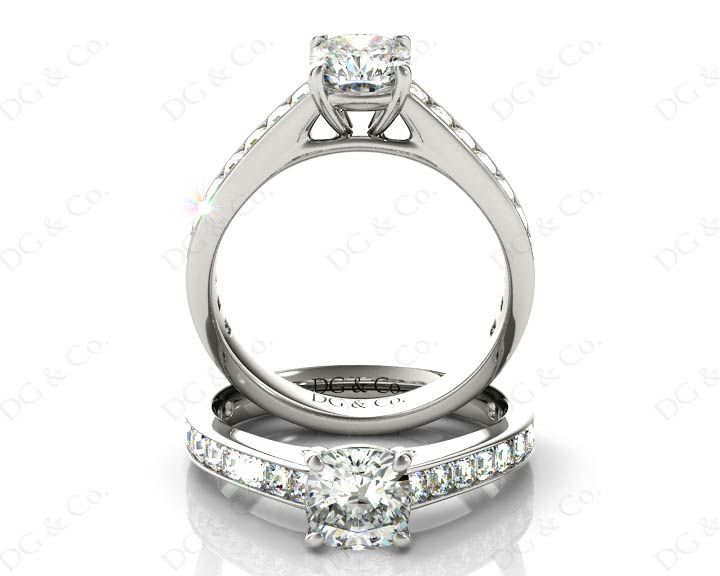 Engagement Ring with a Cushion Cut Diamond Four Claws set in the centre and twenty Asscher Cut Diamonds Channel Set into the Shoulders.